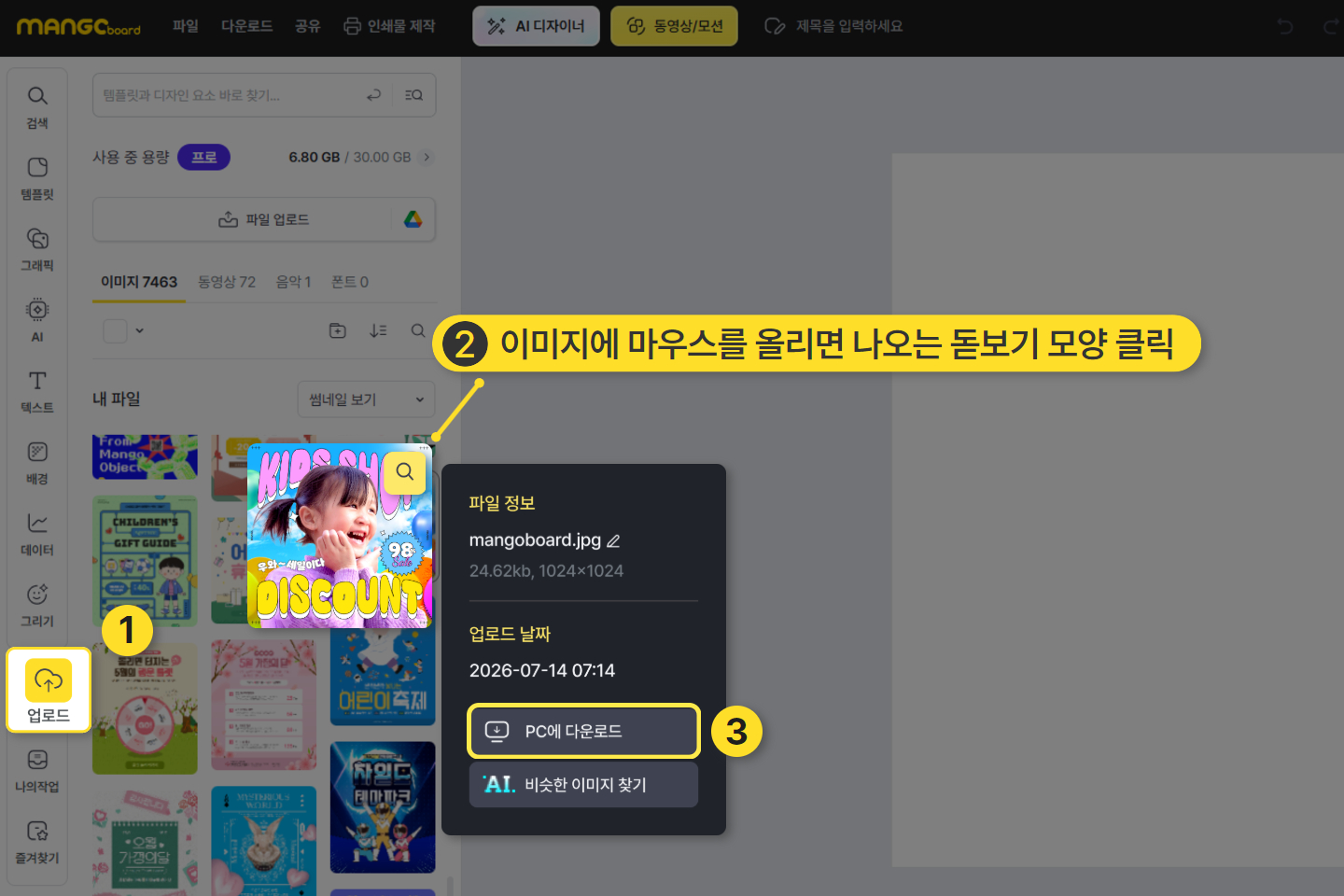 돋보기 모양을 클릭하면 [PC에 다운로드]를 눌러 내 PC에 다시 저장할 수 있습니다.