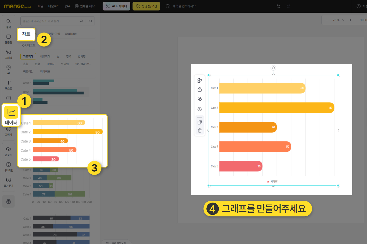 좌측 메뉴 탭에서 '데이터'를 선택하고 차트로 들어가서 차트를 하나 선택해서 슬라이드로 옮깁니다.