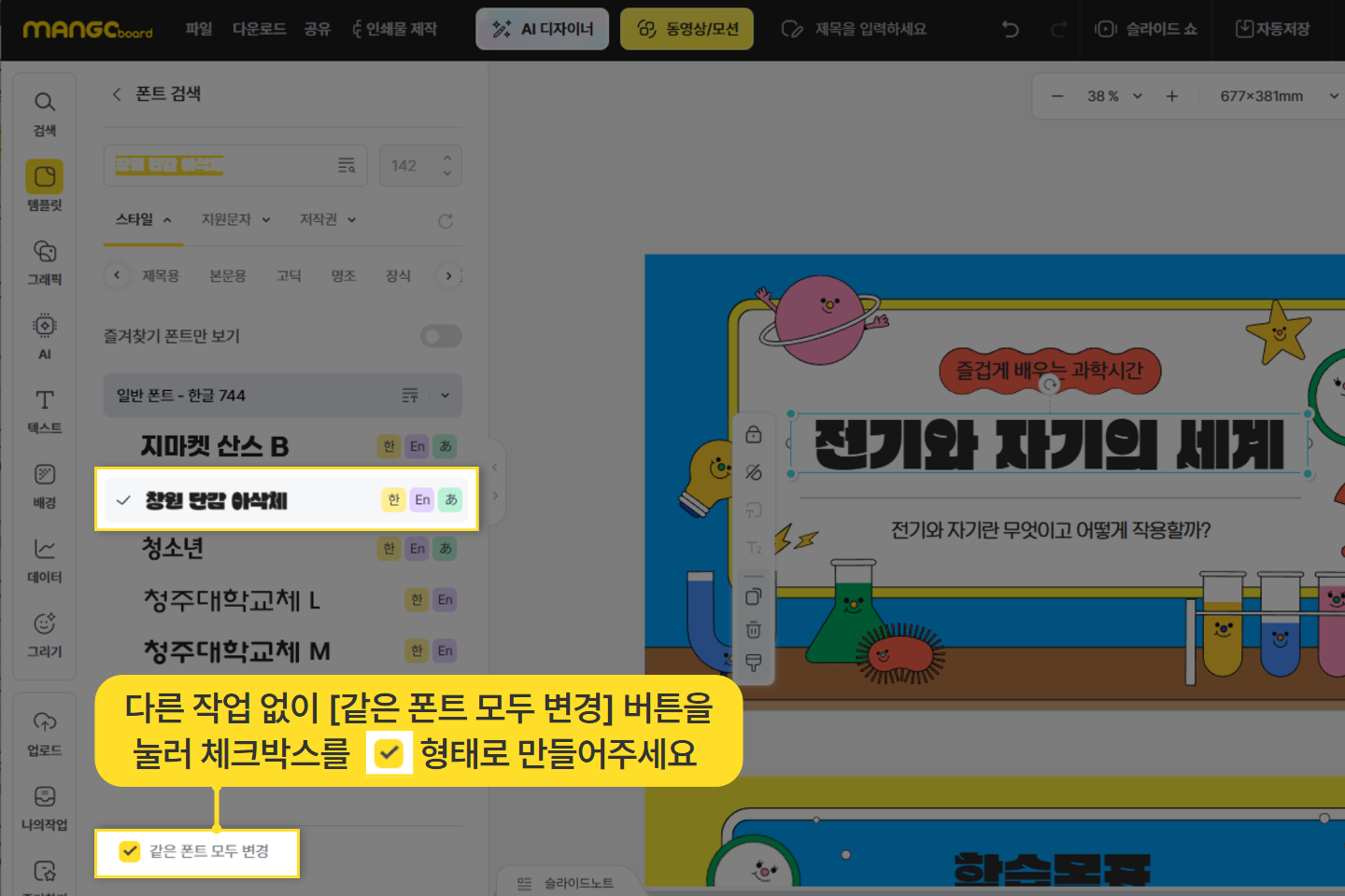 맨 아래에 있는 [같은 폰트 모두 변경] 버튼을 눌러 주세요