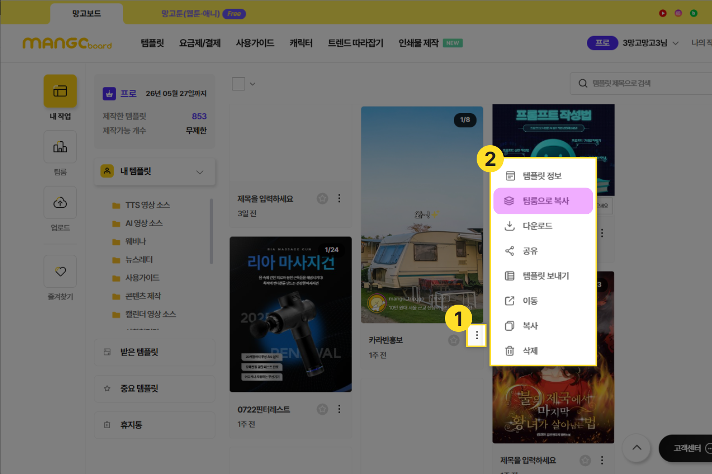 복사할 템플릿 썸네일의 우측 하단의 점 3개를 클릭한 후 나의작업에 복사를 선택합니다.