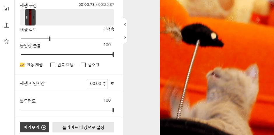 슬라이드 위에 있는 영상을 클릭한 후 좌측에 뜨는 메뉴에서 영상의 재생 구간 설정과 속도 조절을 할 수 있습니다.