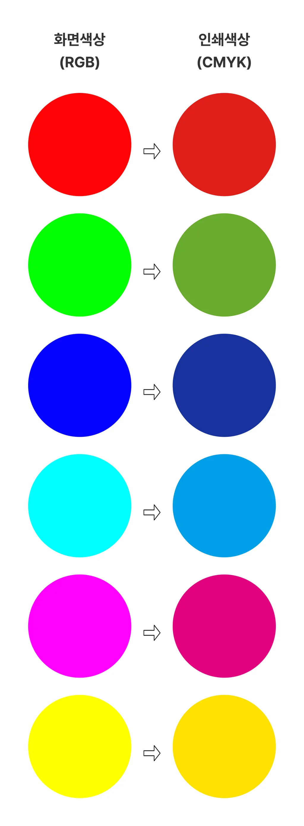 특히 형광색·쨍한 원색 등은 인쇄 공정에서 모니터에서 본 색감 그대로 구현하기 어렵습니다.