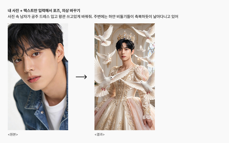 사진 업로드 → " 사진 속 남자가 공주 드레스 입고 왕관 쓰고있게 바꿔줘. 주변에는 하얀 비둘기들이 축복하듯이 날아다니고 있어 "