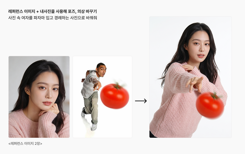 인물 사진 + 참고 사진 2장 동시 업로드 → "첨부 사진 속 여자가 토마토를 던지게 해줘" / “사진 속 여자를 파자마 입고 경례하는 사진으로 바꿔줘”