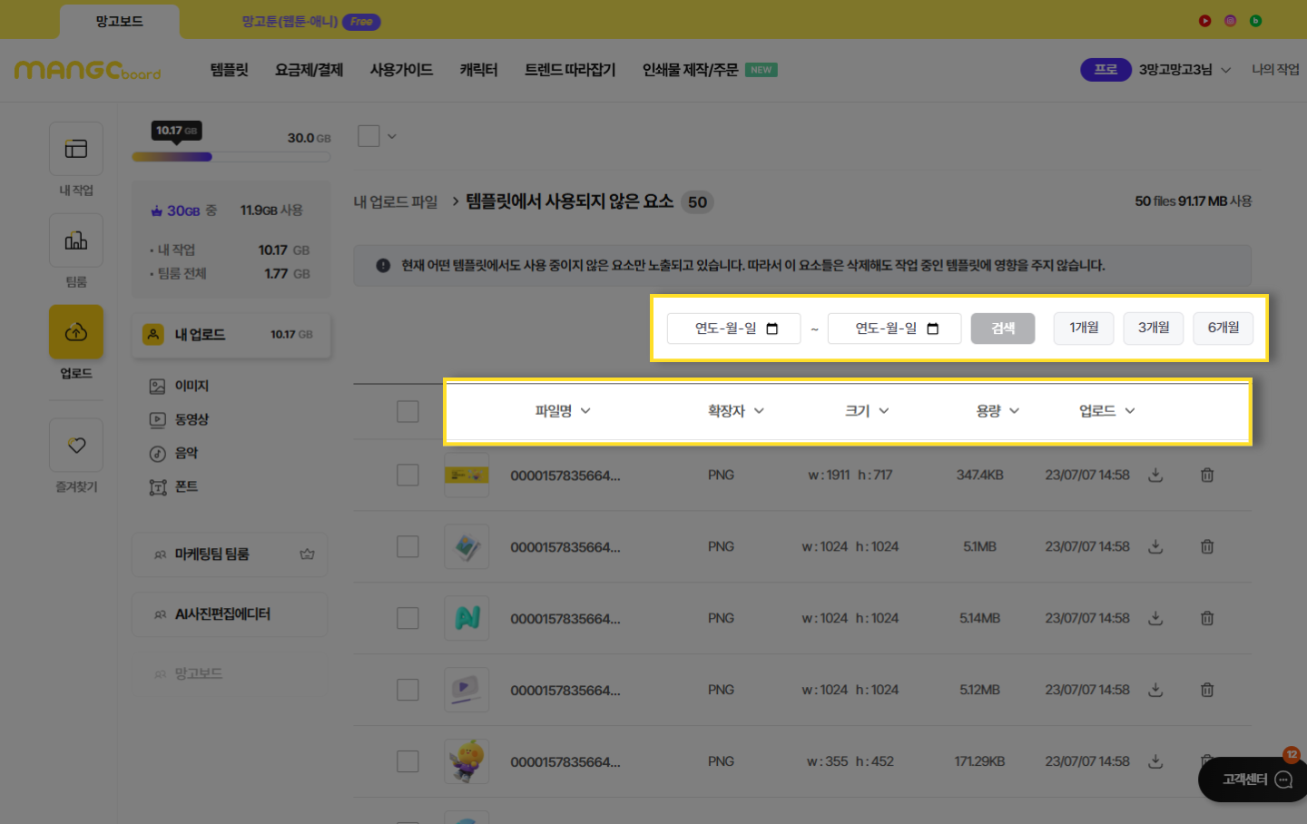 파일명, 확장자, 크기, 용량, 업로드일별로 정렬하여 편리하게 확인할 수 있습니다.