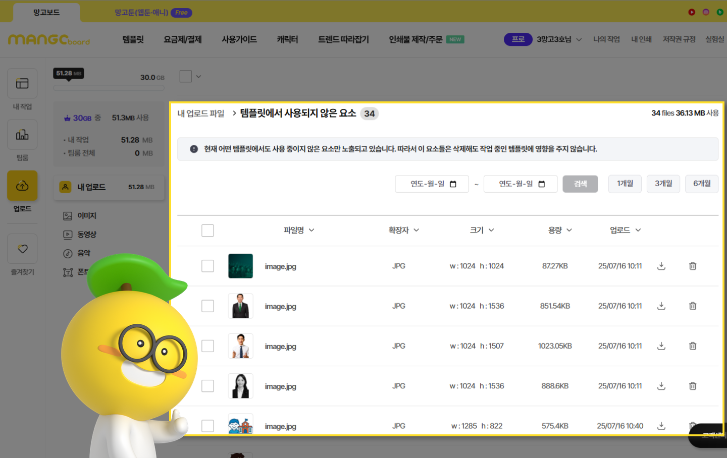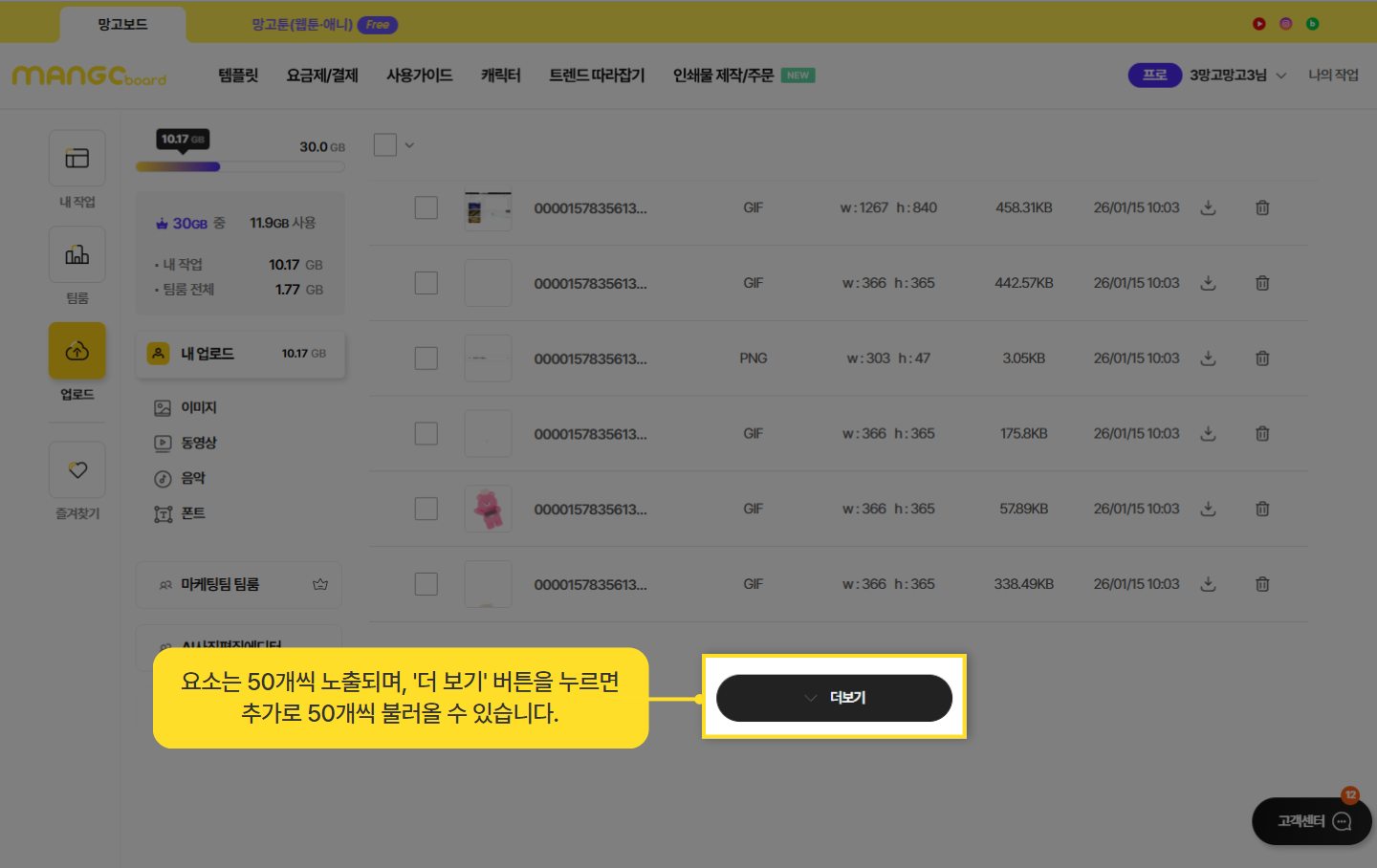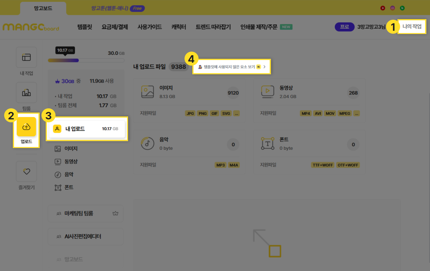 이 기능은 망고보드 홈페이지 내 [나의 작업] 페이지에서만 확인할 수 있으며,