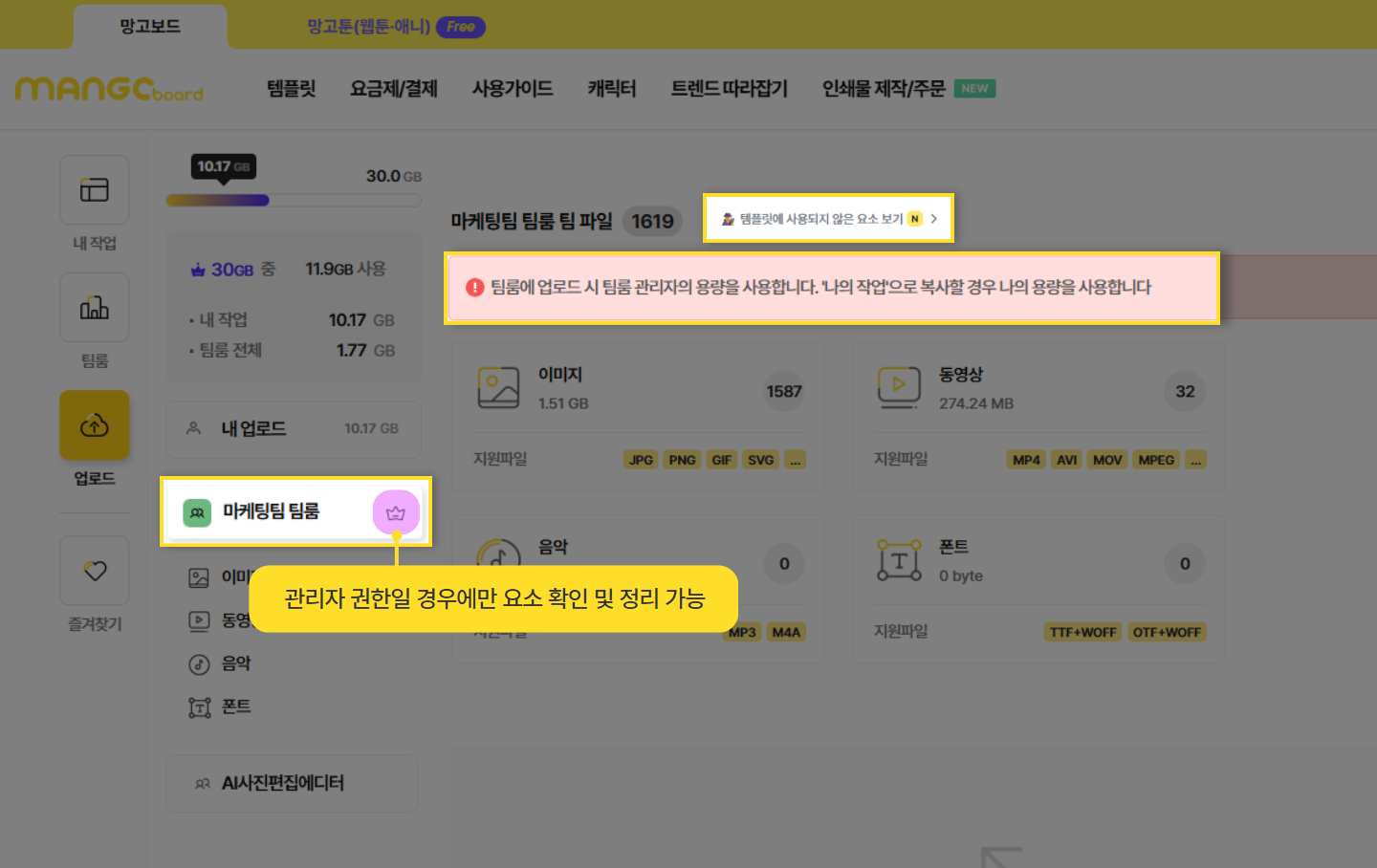 다만 팀룸에 업로드 시 관리자의 업로드 용량을 사용하는 것이기 때문에,