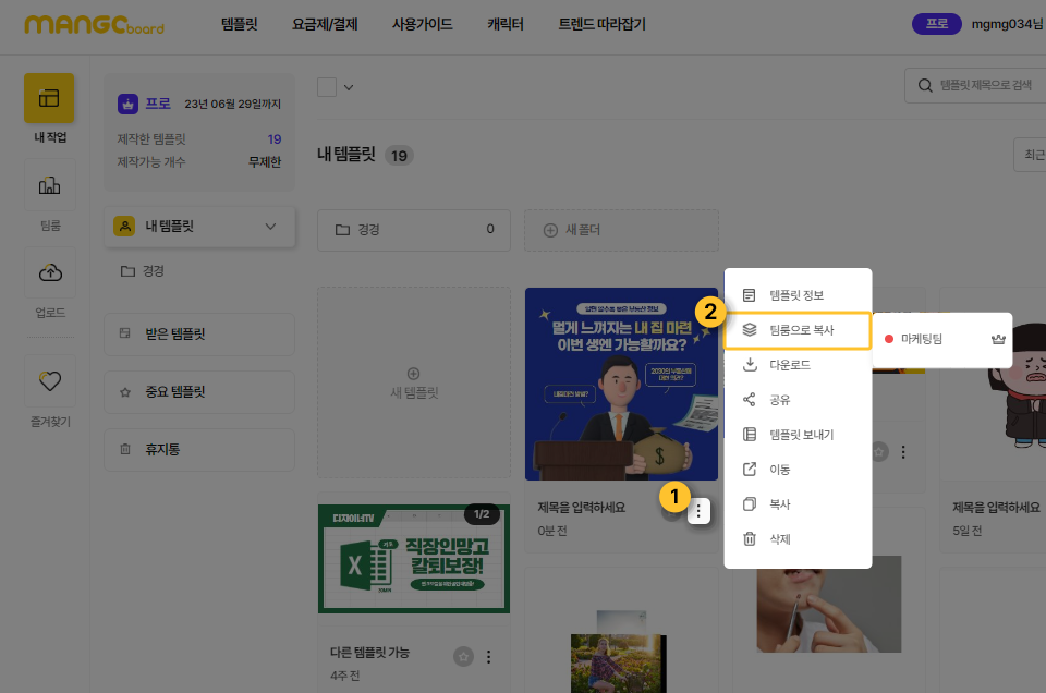 복사할 템플릿 썸네일의 우측 하단의 점 3개를 클릭한 후 나의작업에 복사를 선택합니다.