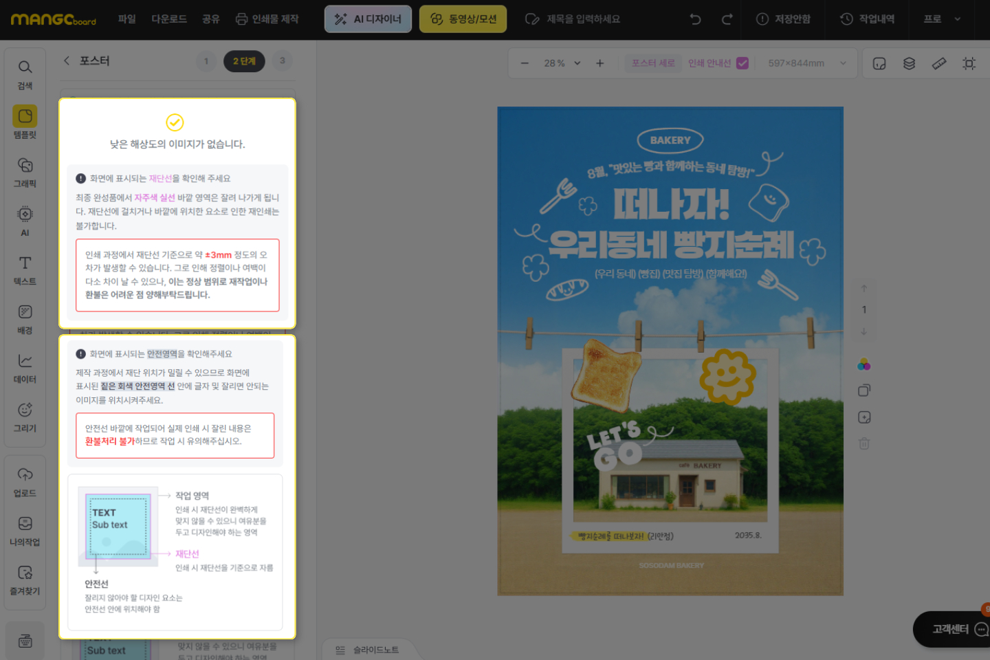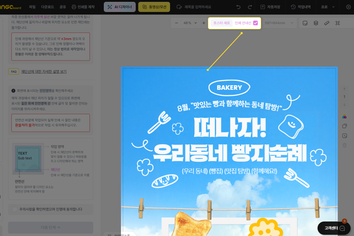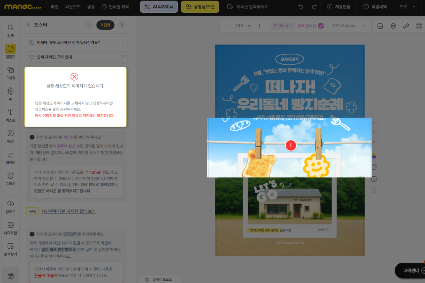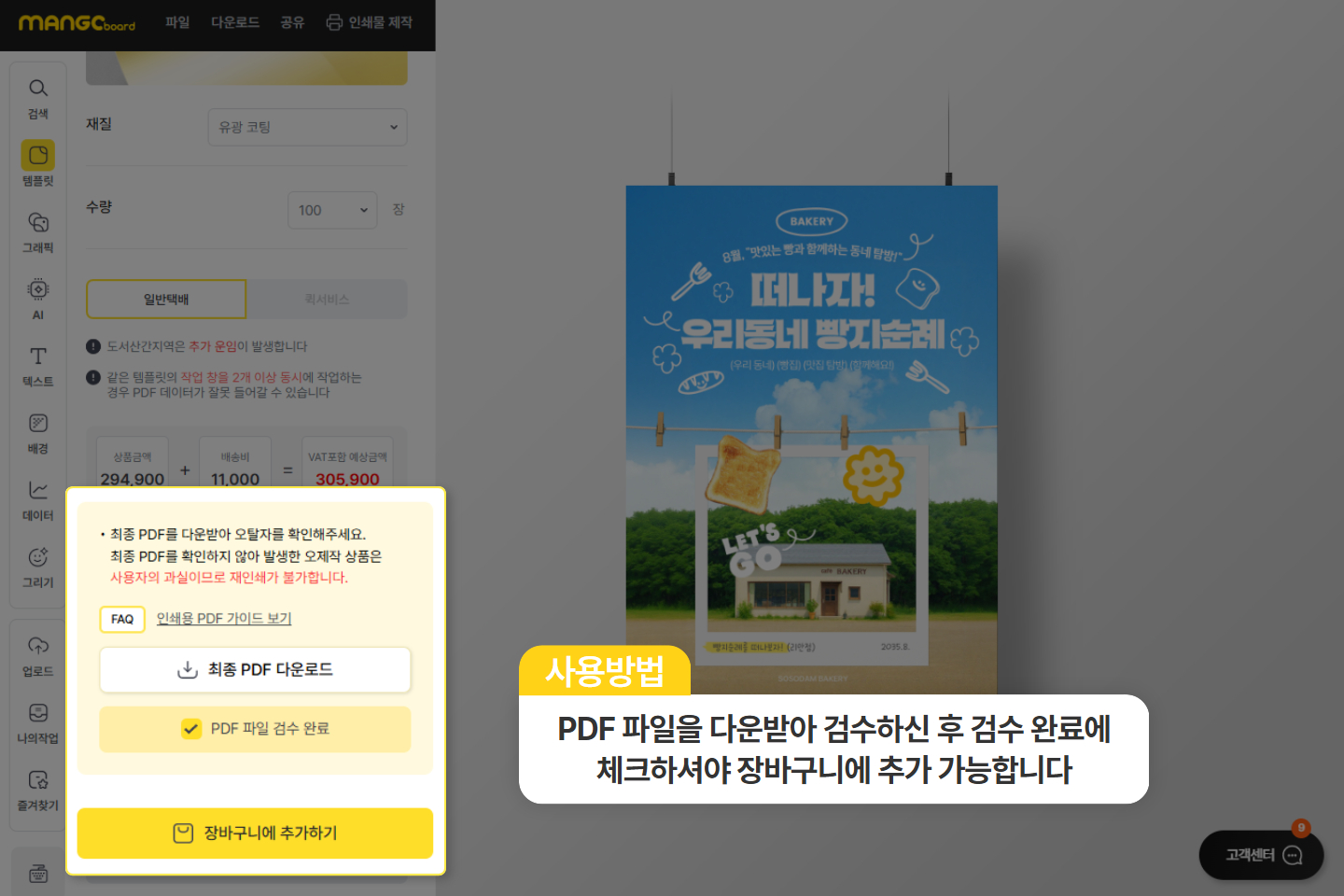 디자인 작업 후, 에디터 화면의 좌측 상단에 "인쇄물 제작" 버튼을 클릭하면