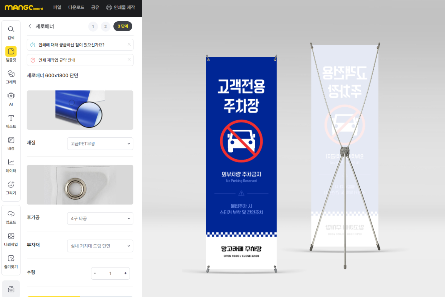 수량과 재질, 거치대 등 옵션을 선택할 때마다 결과물을 미리 볼 수 있어서 쉽게 참고할 수 있습니다.