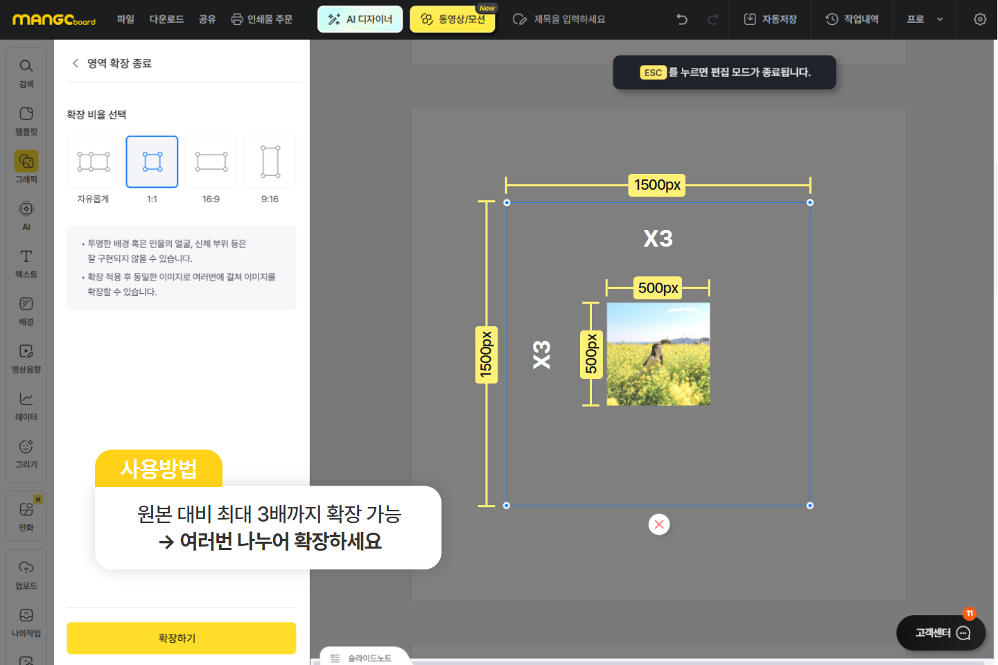 확장하기를 원하는 사진을 클릭한 후 나타나는 좌측 도구창에서 '영역 확장'을 클릭하여