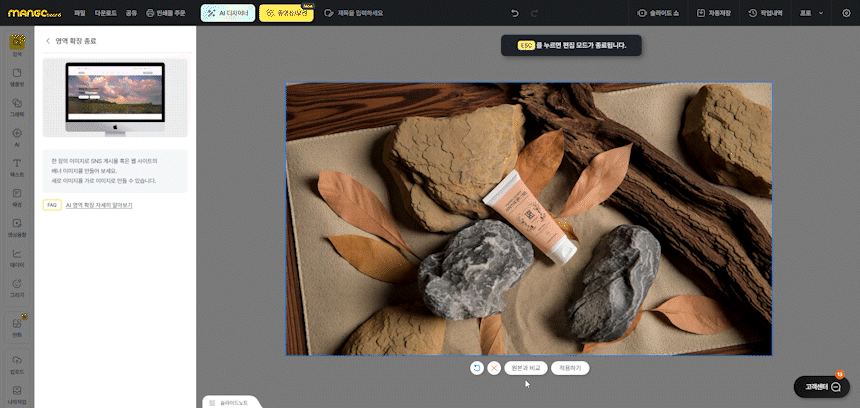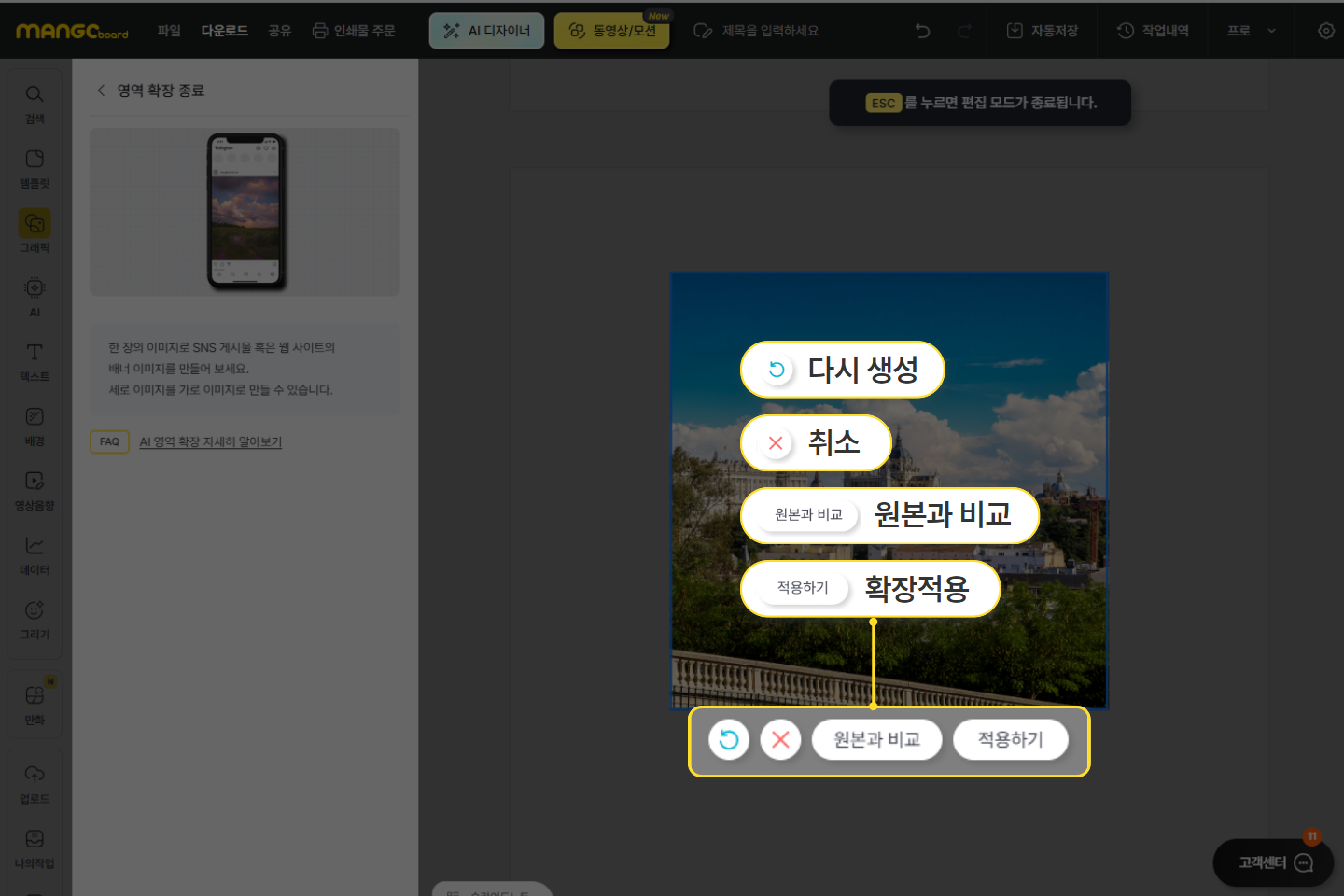 망고보드의 영역 확장 기능은 이미지를 넓히고 싶을 때 AI가 빈 곳을 자동으로 채워 주는 기능입니다.