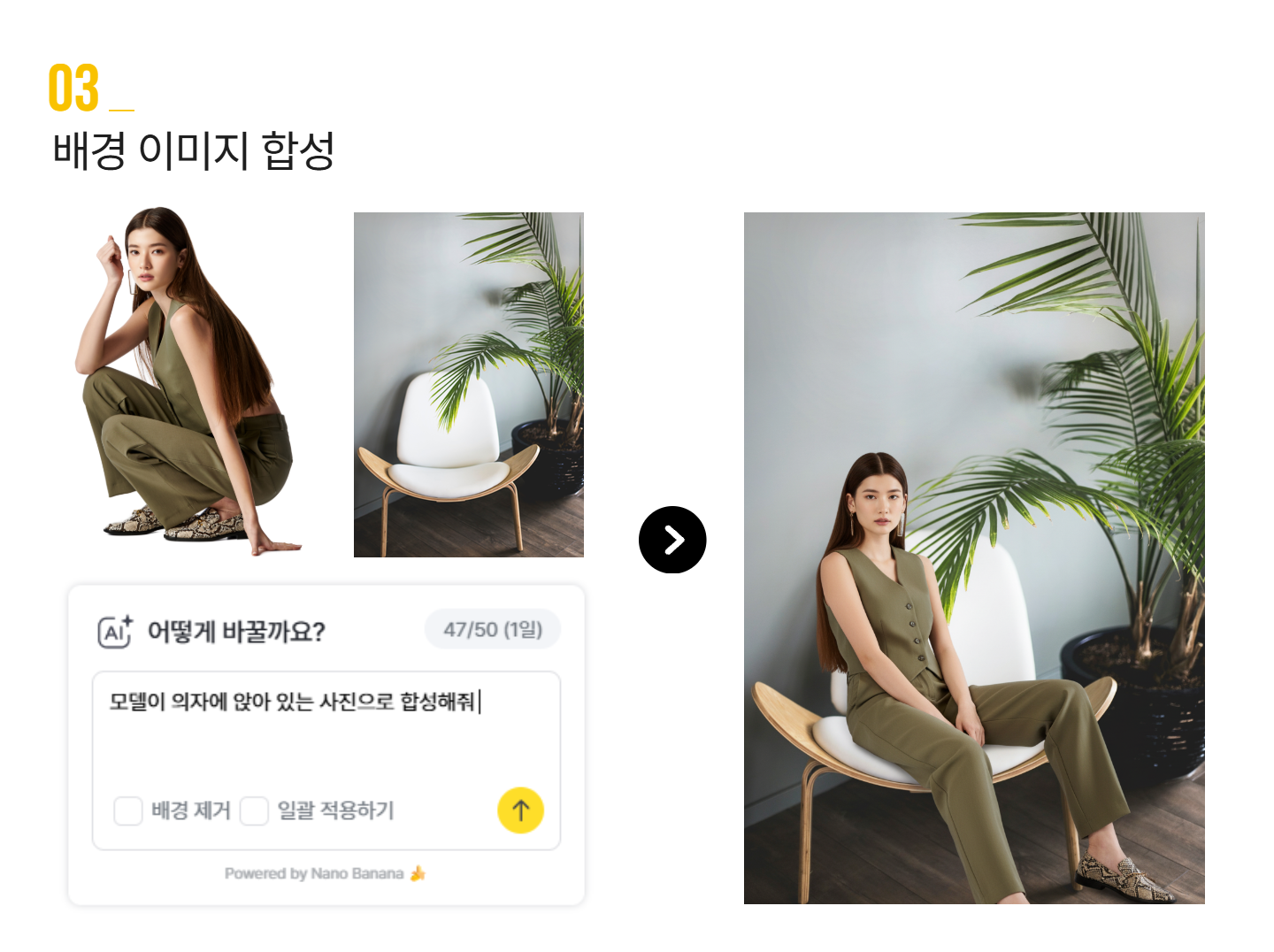 내 제품 사진을 모델 사진에 손쉽게 합성할 수 있는 AI 기능입니다.