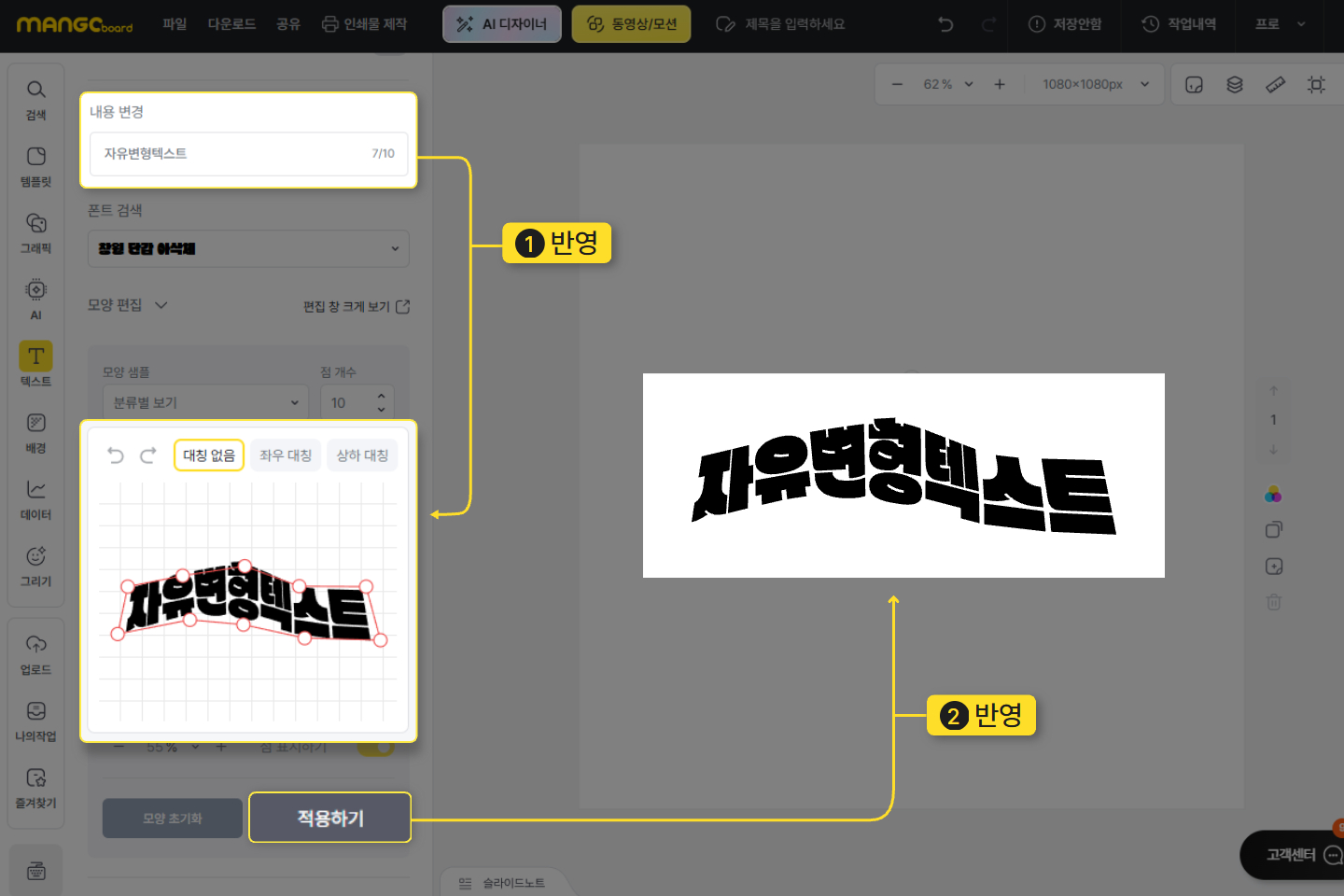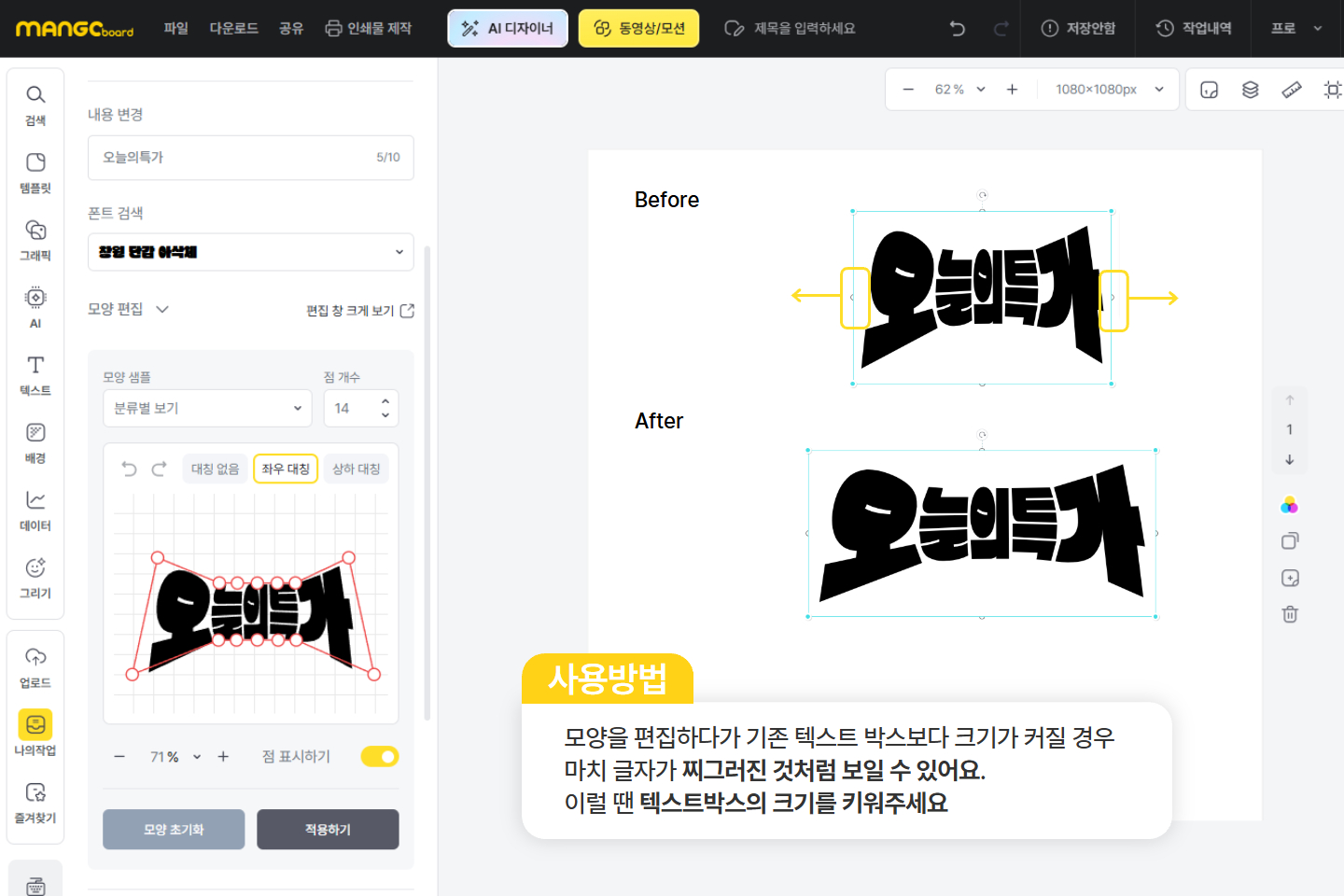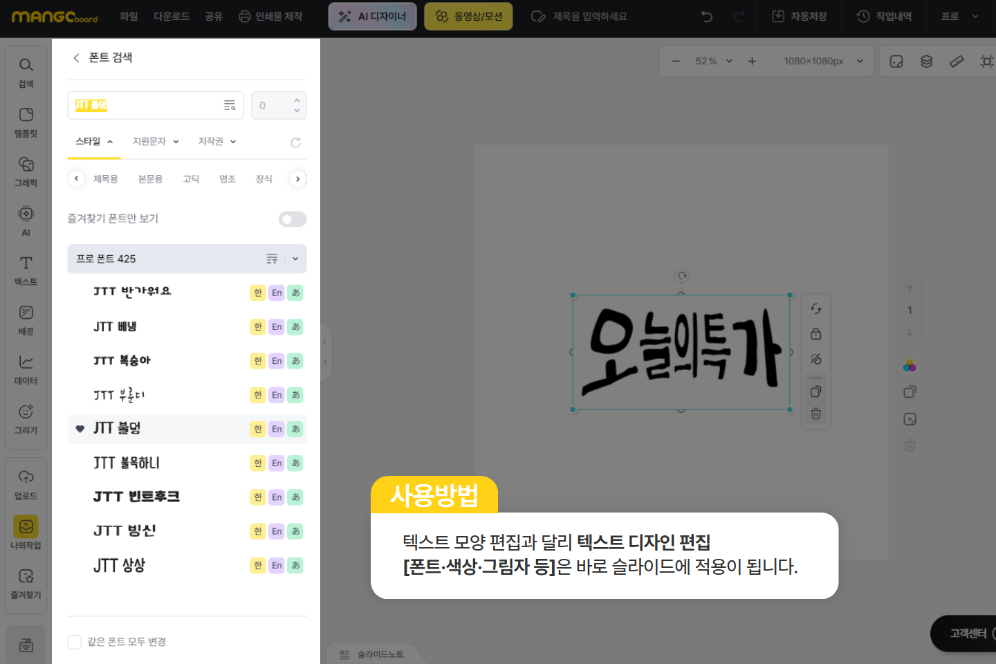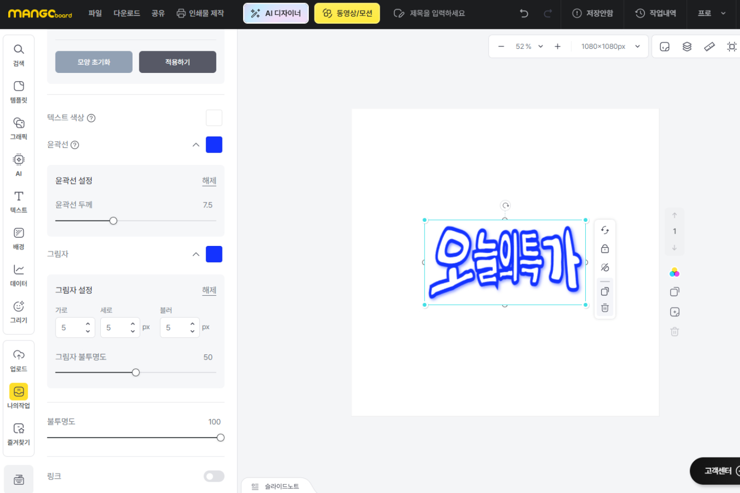 디자인 영역[폰트·색상·윤곽선·그림자·불투명도 등]도 자유롭게 편집 가능합니다.