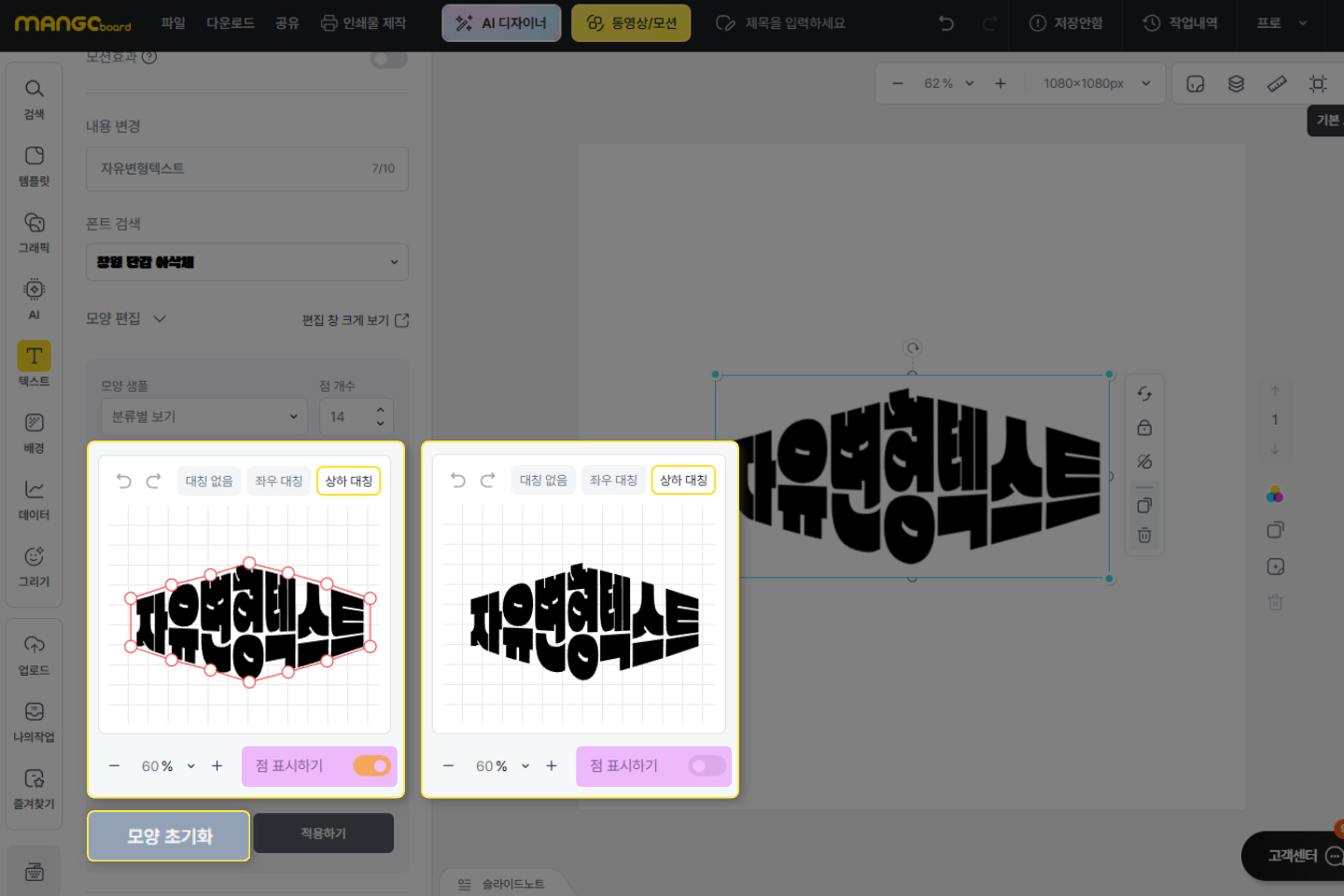 대칭, 점 표시, 초기화 모두 기존 편집창과 동일하게 작업할 수 있습니다.