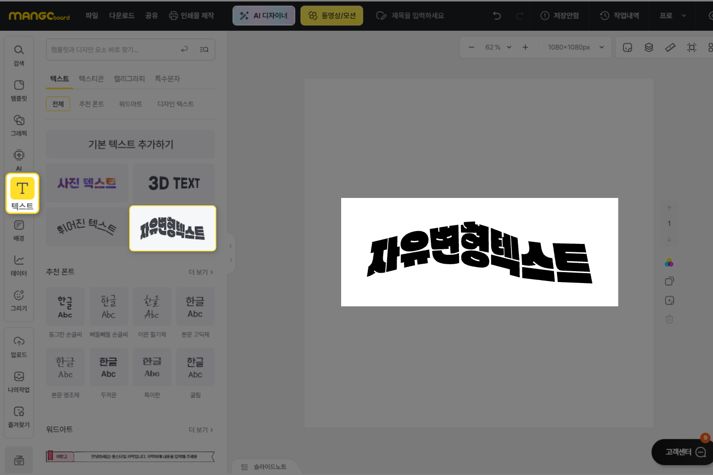 먼저 [텍스트 > 자유변형 텍스트]를 눌러주세요.