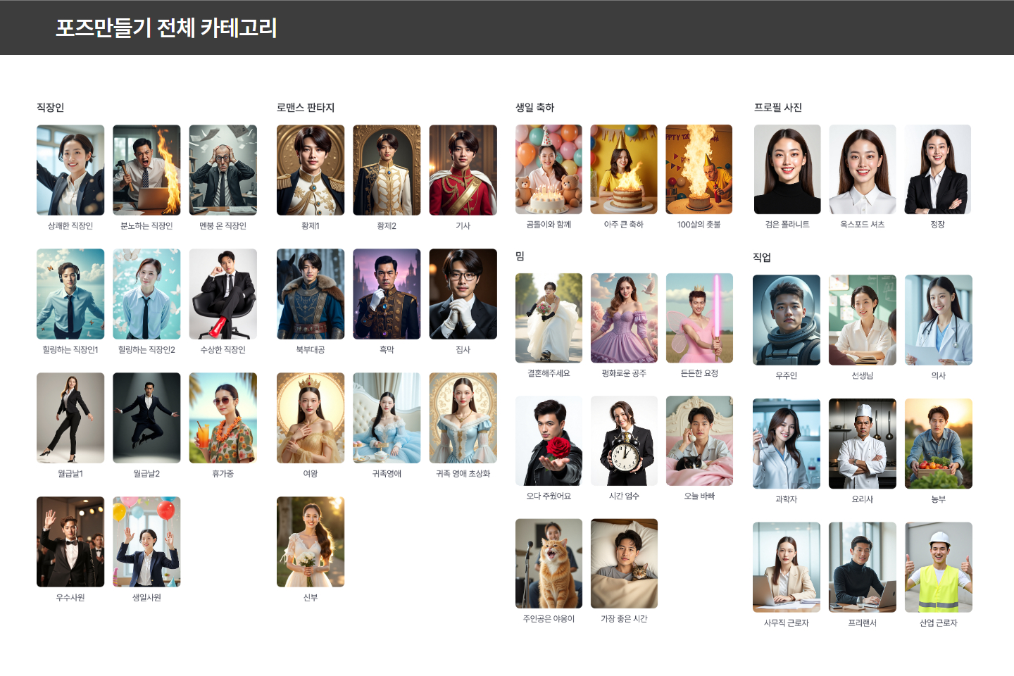 AI 포즈만들기는 선택한 카테고리의 포즈와 이미지에