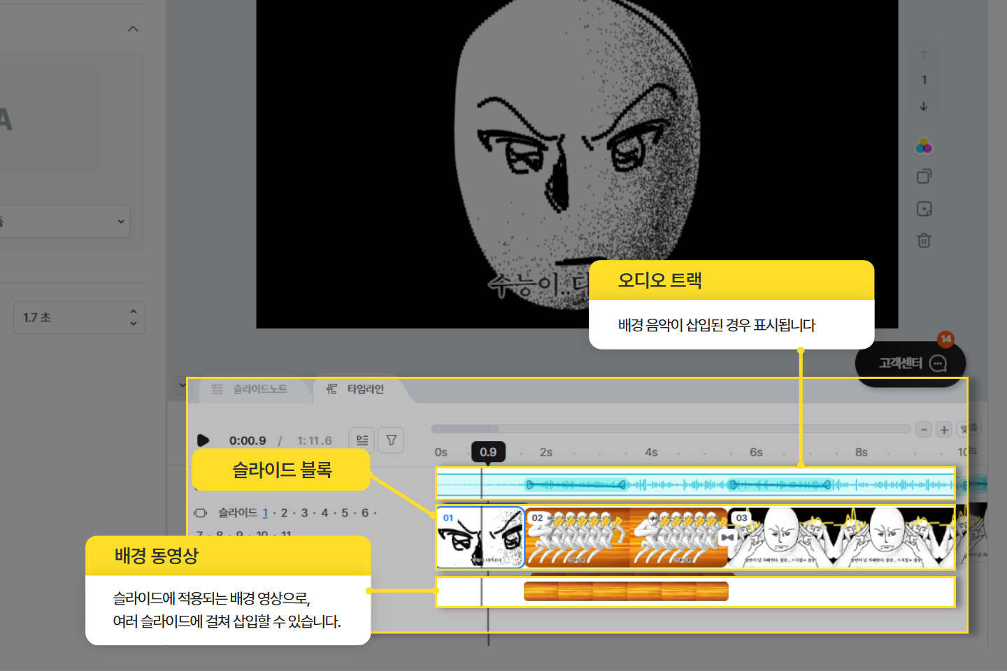 동영상 타임라인 화면은 아래와 같은 구성으로 사용하실 수 있습니다.
