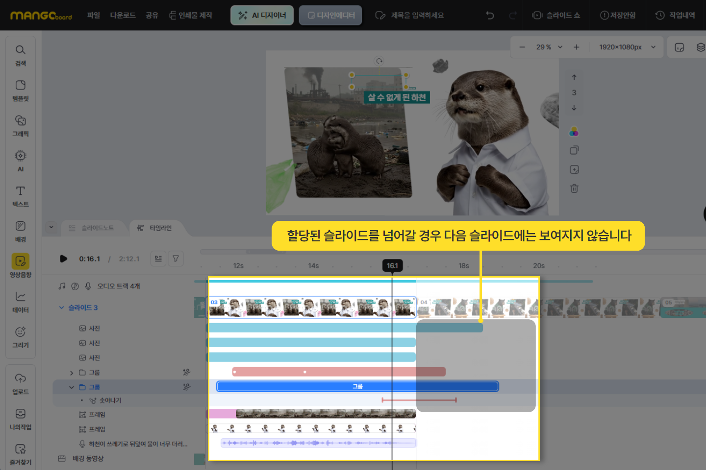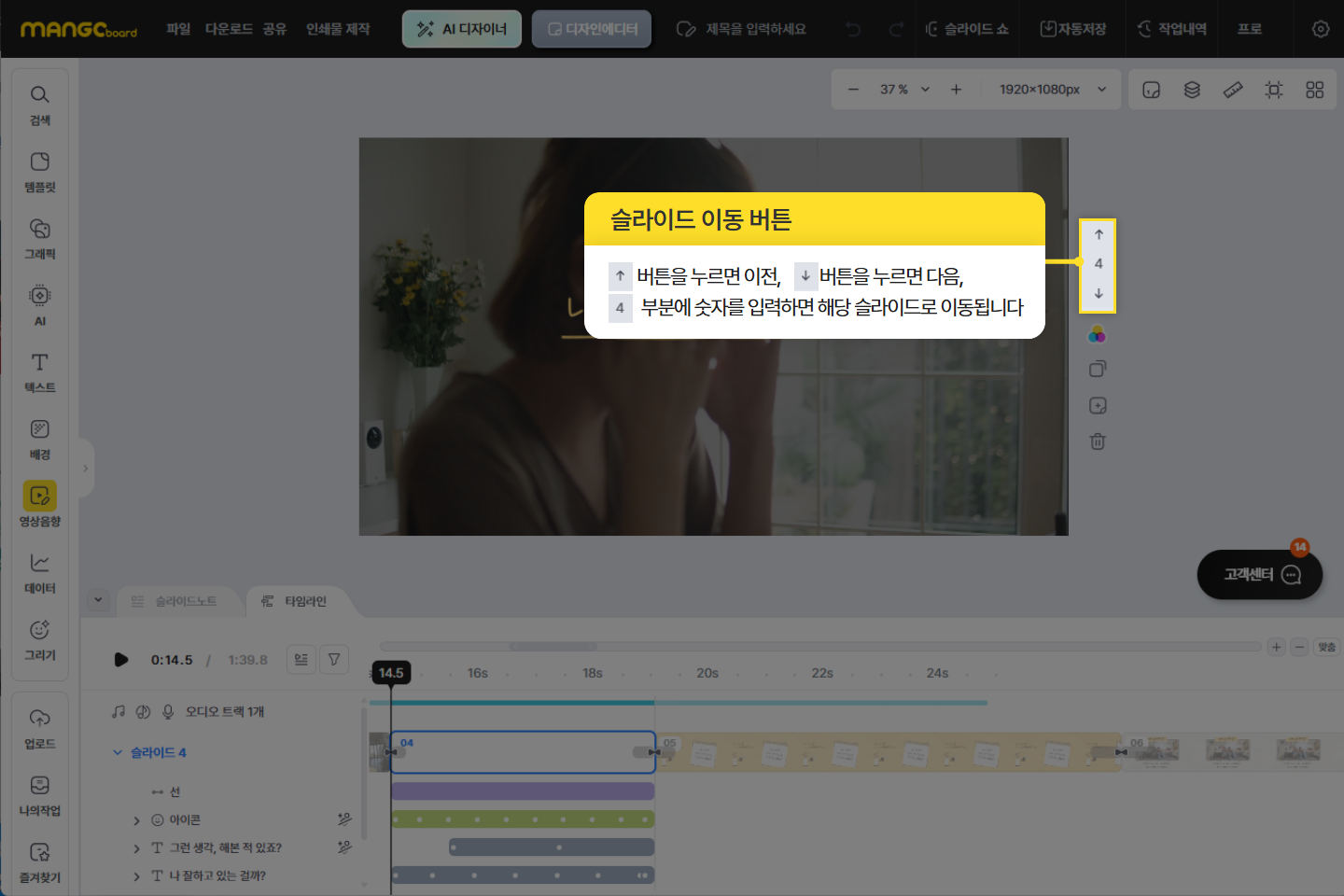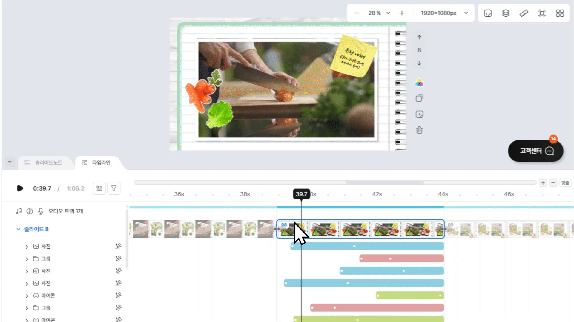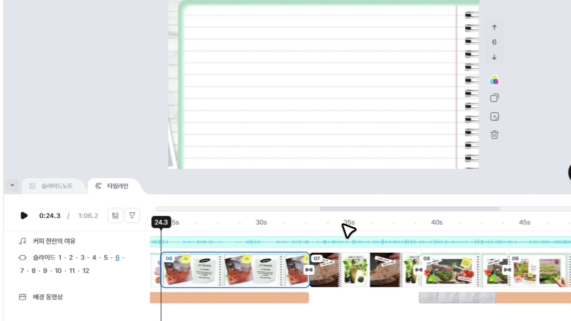 슬라이드 순서는 타임라인에서 슬라이드 블록을 드래그해 원하는 위치로 옮겨 주시면 됩니다.