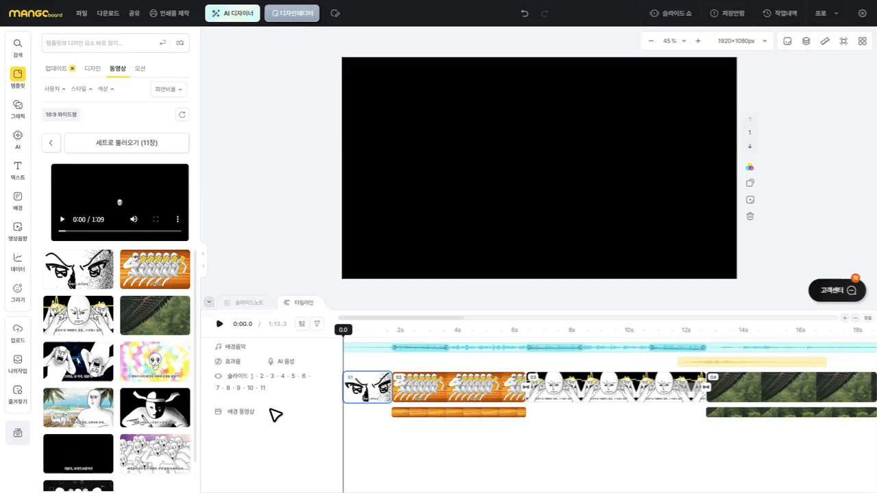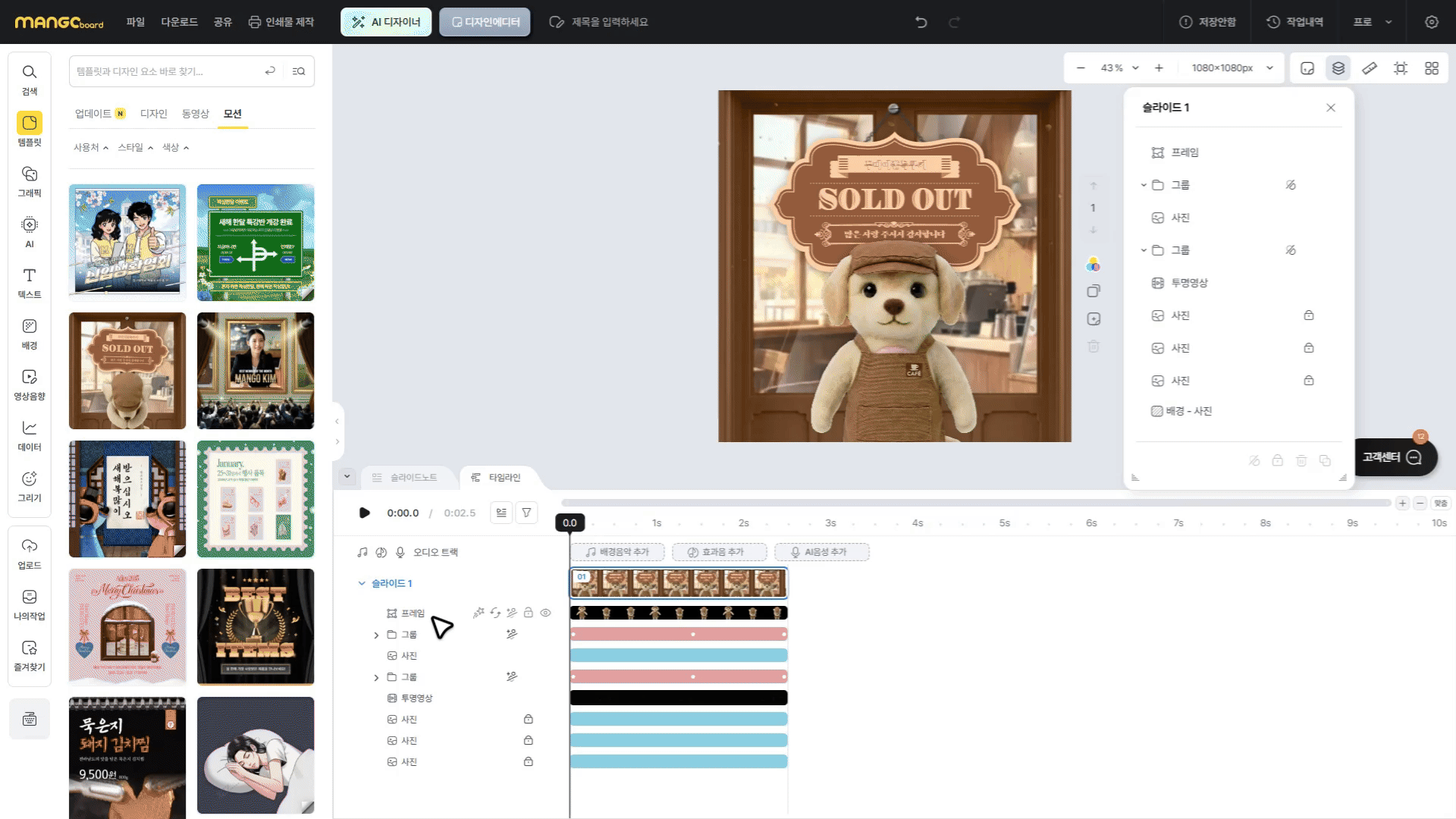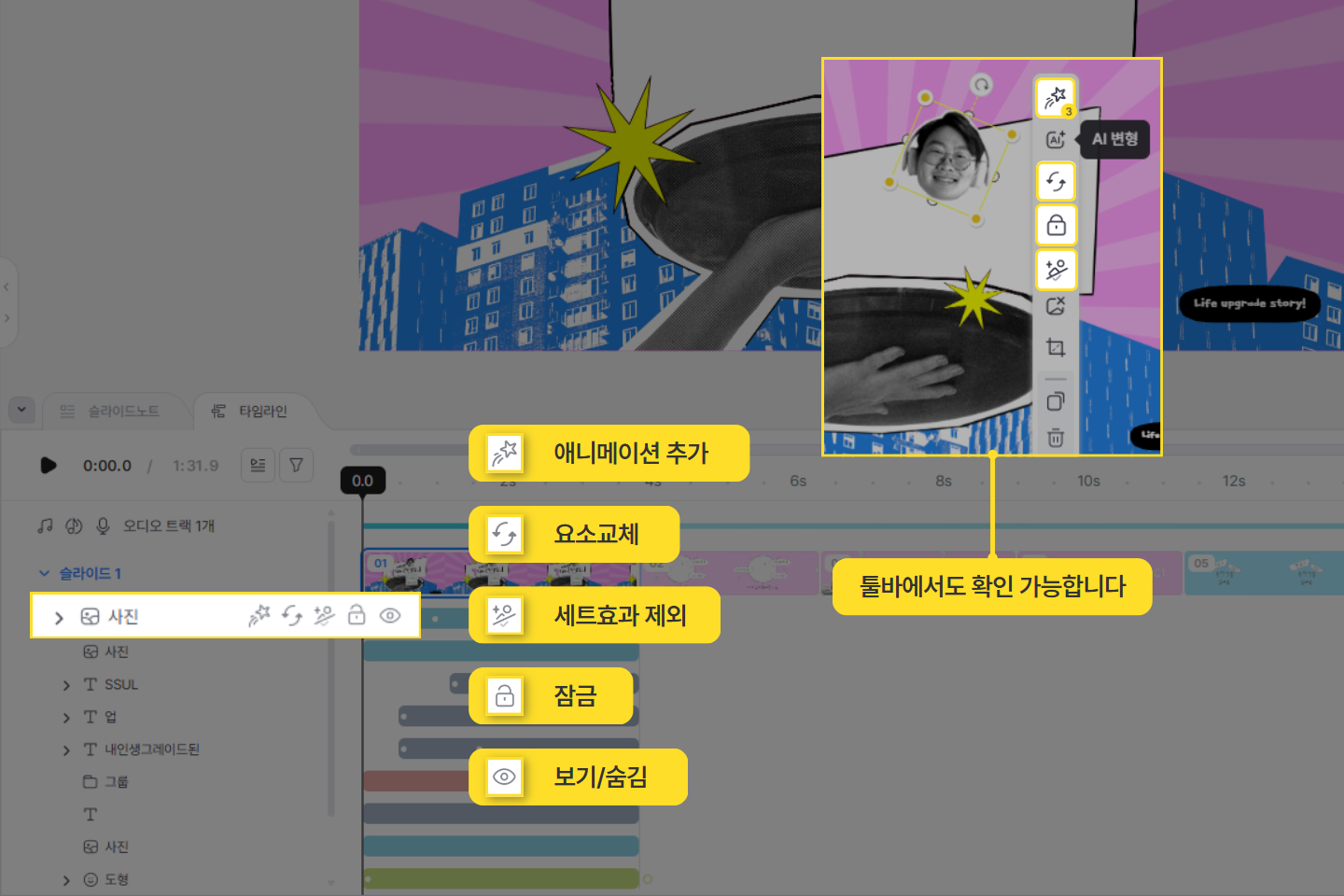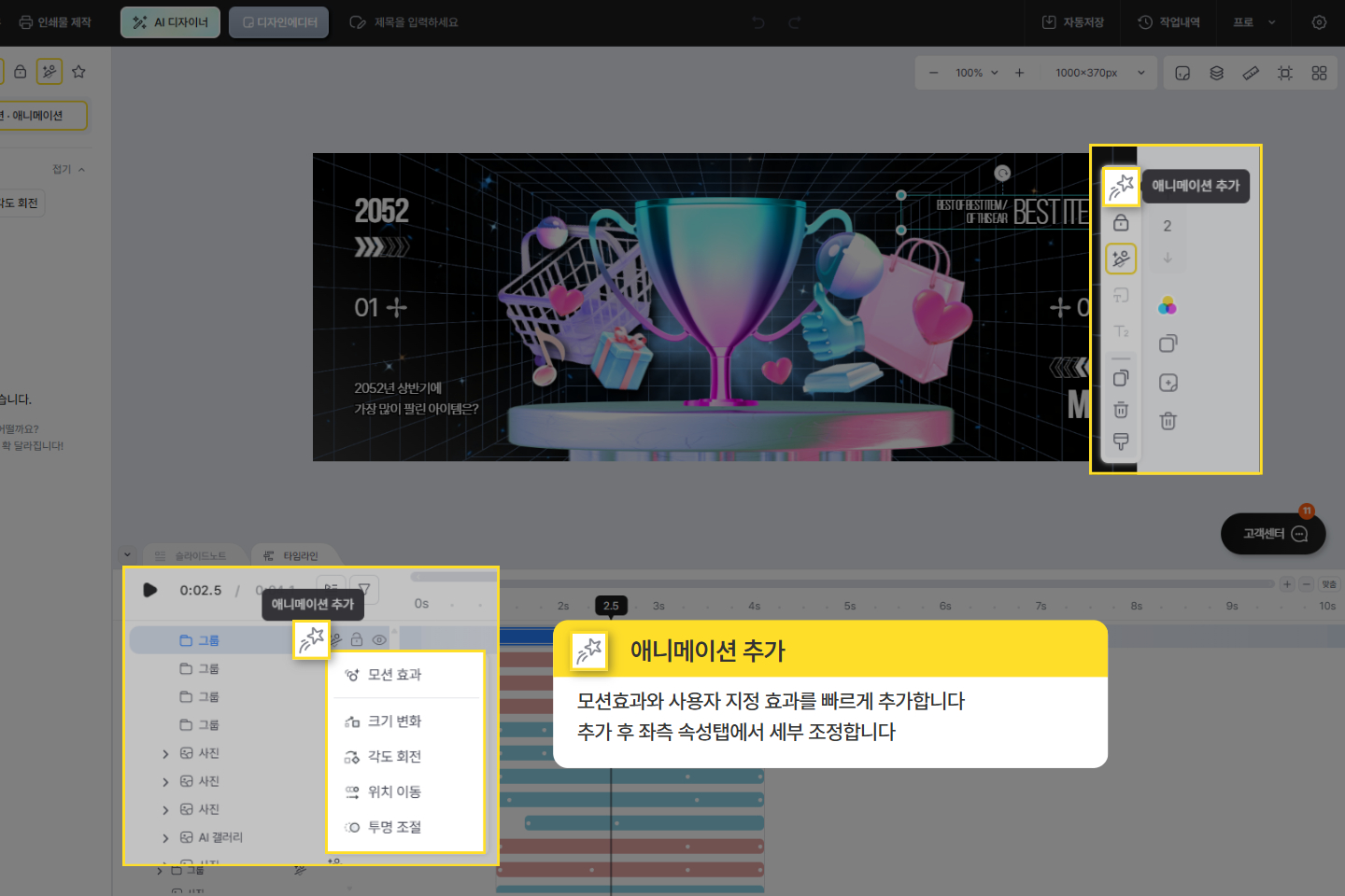 모션효과와 사용자 지정 효과(크기 변화, 각도 회전, 위치 이동, 투명 조절)를 빠르게 추가할 수 있습니다.