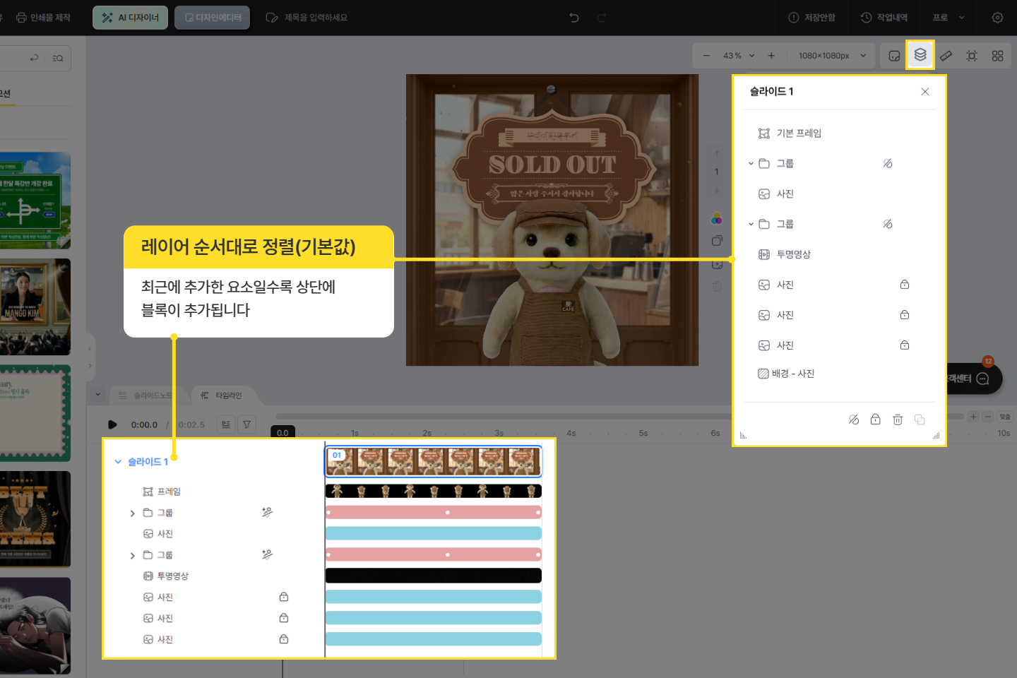 타임라인 레이어 목록은 기본적으로 ‘레이어 순서대로’ 정렬됩니다.