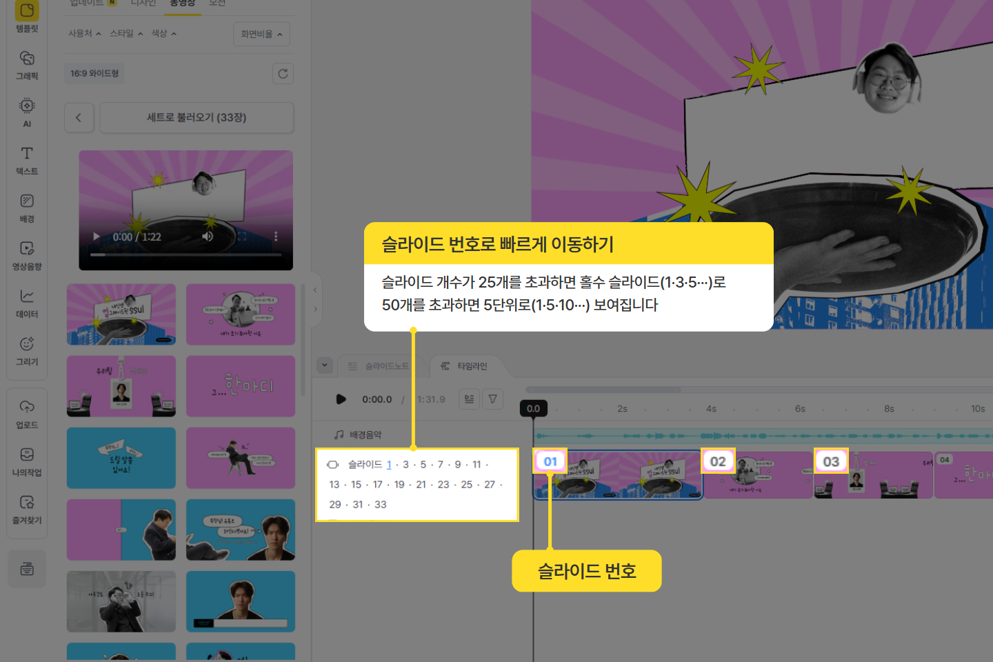 슬라이드 개수가 많아졌을 때 원하는 페이지로 한 번에 이동하고 싶은 경우, 좌측 슬라이드 번호를 눌러주세요.