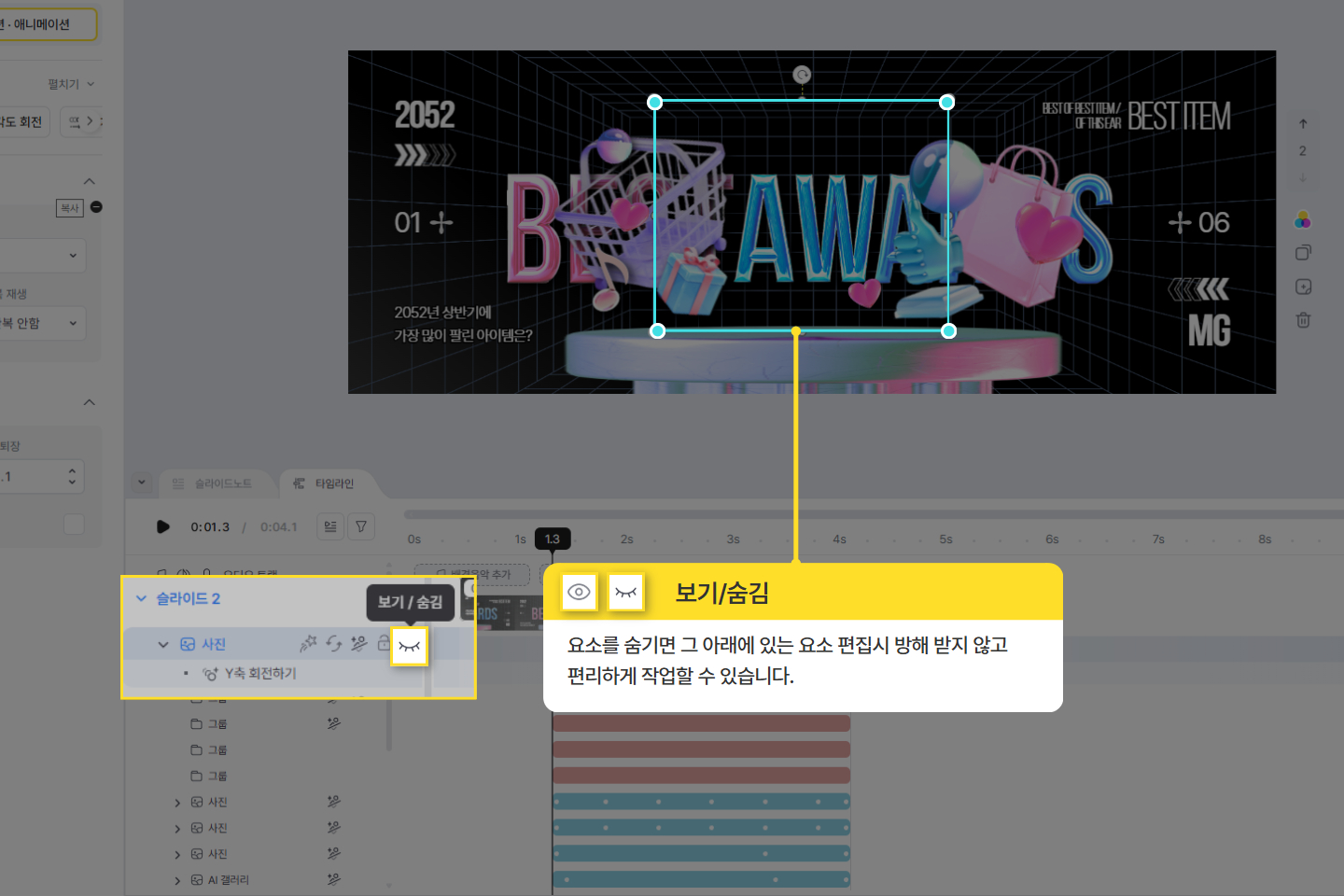 위에 있는 요소를 숨기면 그 아래에 있는 요소를 방해 받지 않고 편리하게 편집할 수 있습니다.