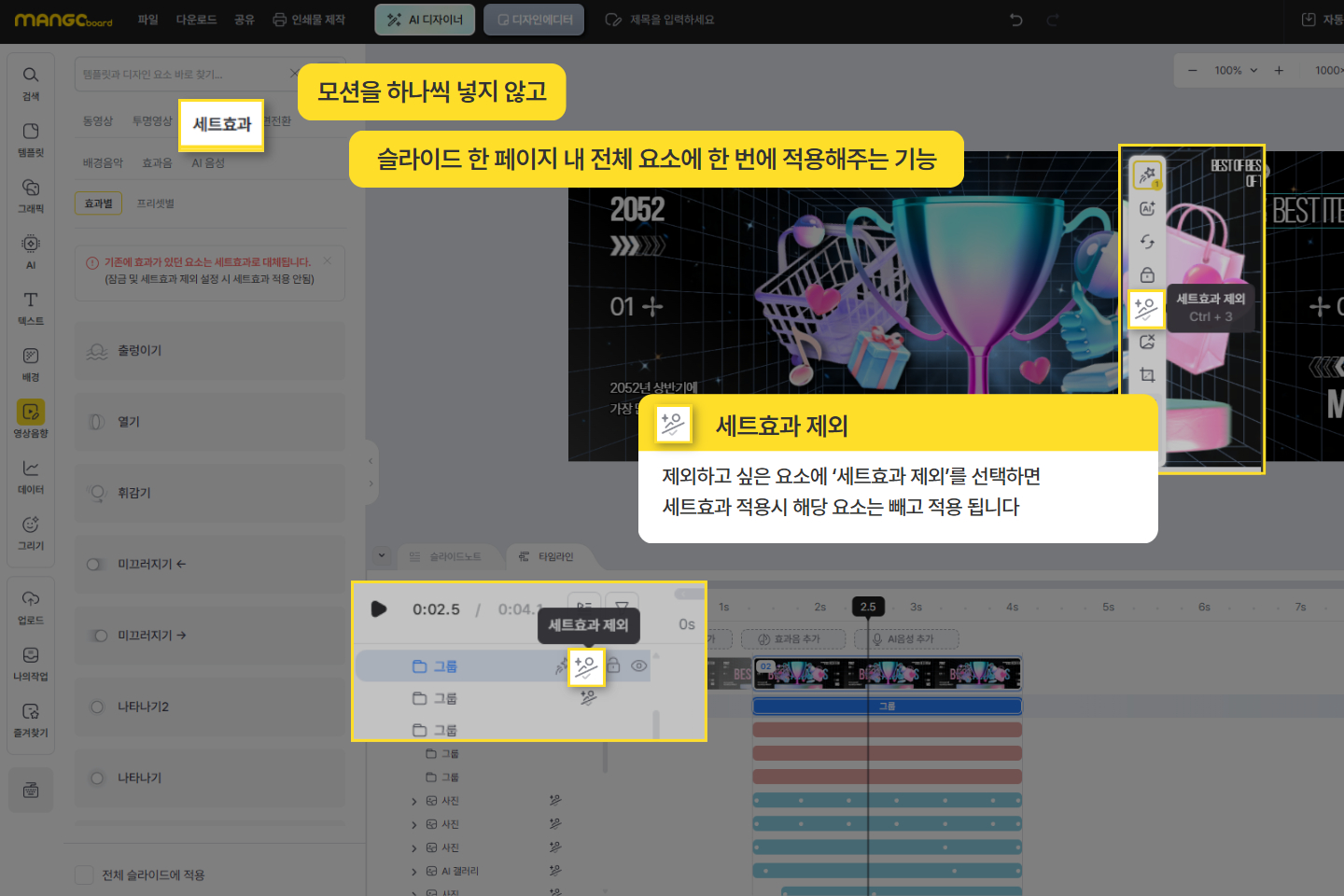 세트 효과는 슬라이드 위의 모든 요소에 적용이 되는 효과이기 때문에
