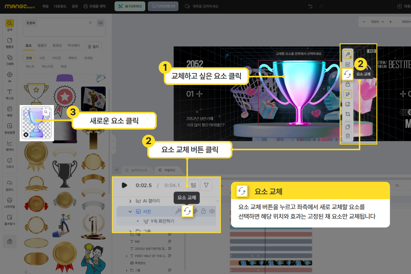 요소 교체 버튼을 누르고 좌측에서 새로 교체할 요소를 선택하면 해당 위치와 효과는 고정된 채 요소만 교체됩니다.