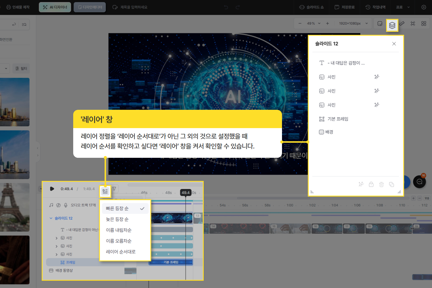 * 단, 빠른 등장 순, 늦은 등장 순, 이름 내림차순, 이름 오름차순에서는 직접 레이어를 이동시킬 수는 없습니다.