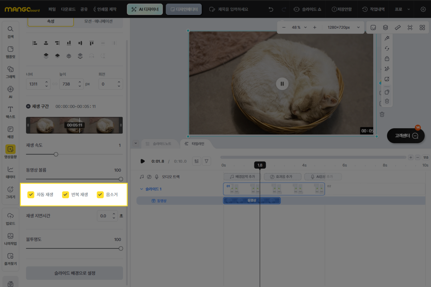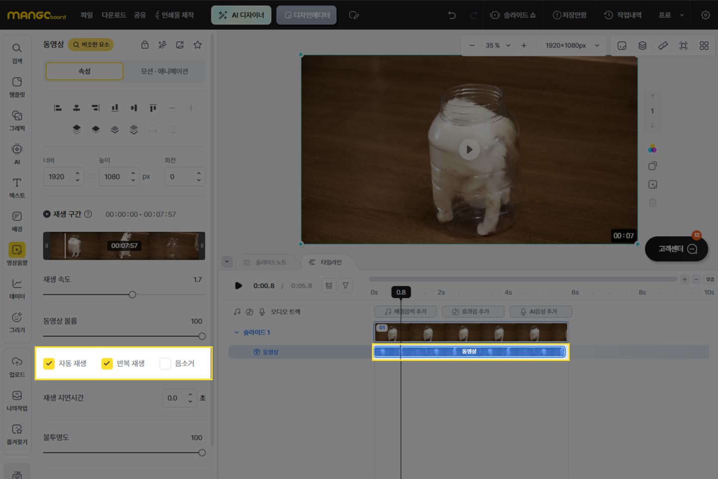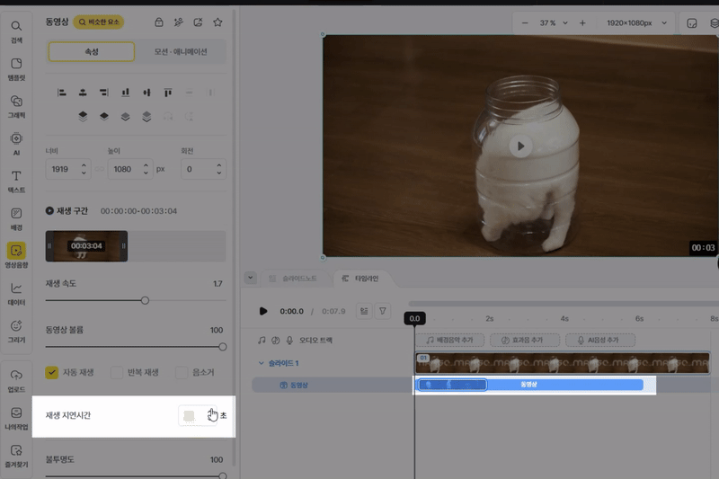 동영상 요소의 ’재생 구간’과 ‘재생 속도’를 조절할 수 있습니다.