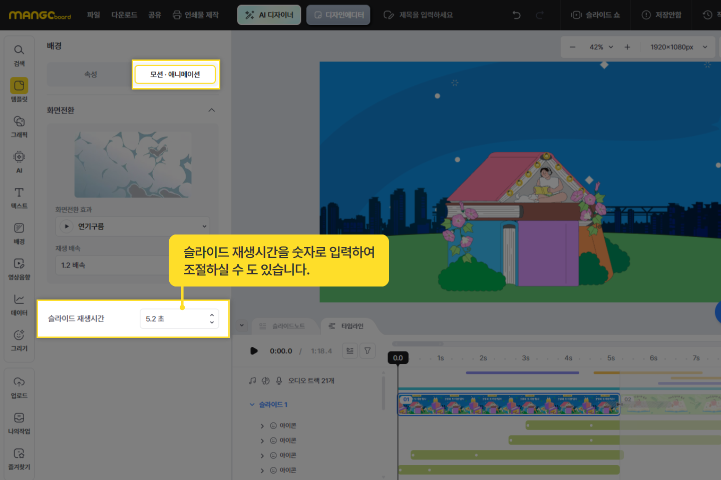 왼 쪽 도구창의 모션• 애니메이션에서 [슬라이드 재생시간] 옆 초수를 입력하여 조절하실 수 있습니다.