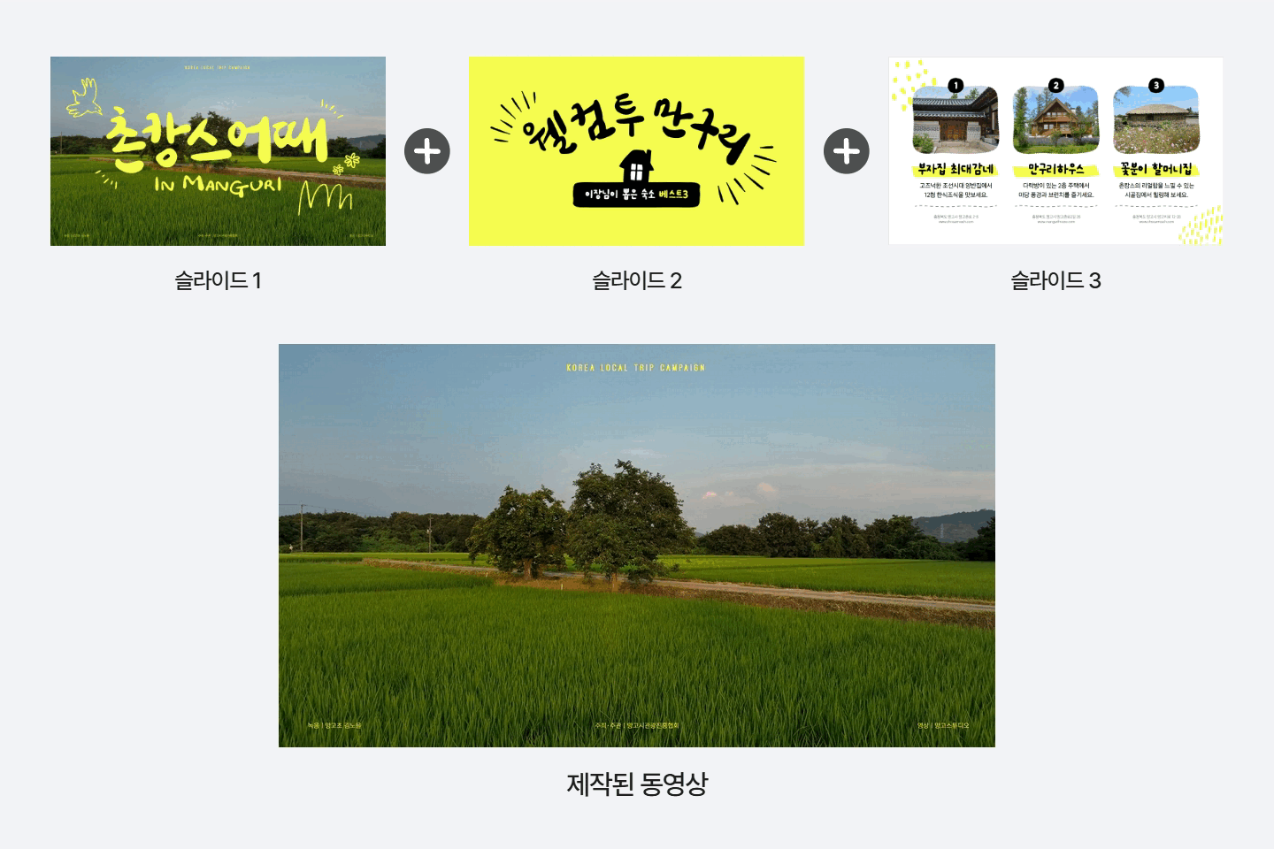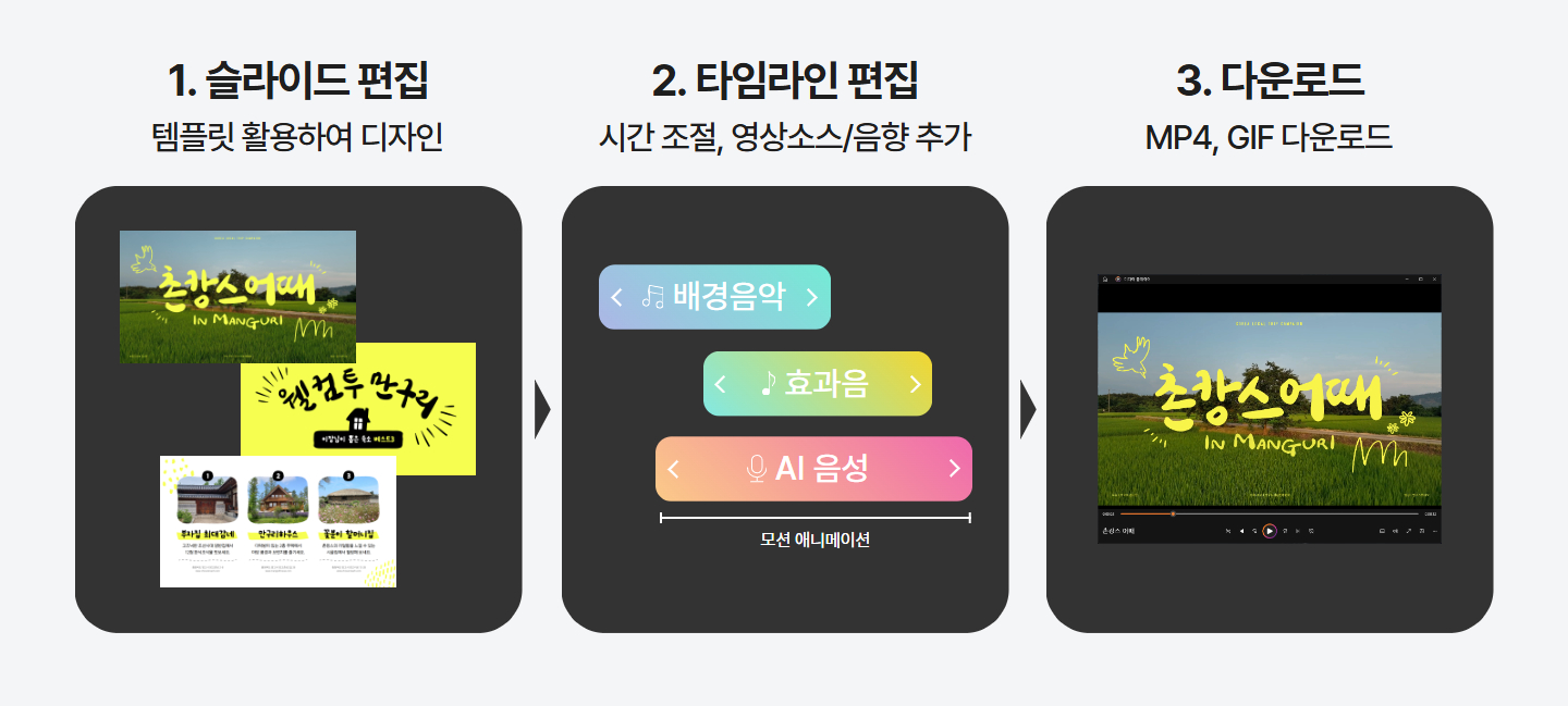 망고보드에서 여러 슬라이드를 편집하면, 그 슬라이드들을 하나로 이어서 동영상으로 만들어줍니다.