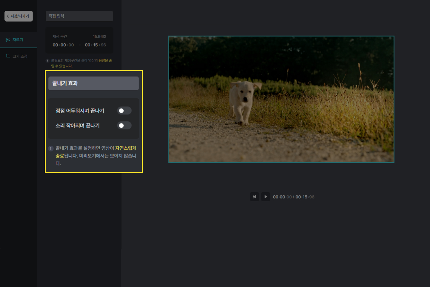 필요에 따라 끝내기 효과(어두워지기, 소리 작아지기)를 넣을 수 있습니다.