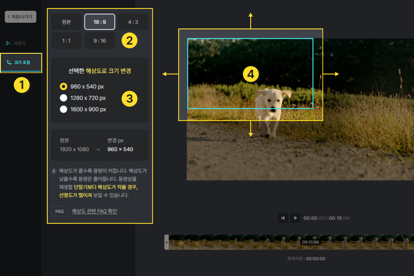 영상 크기 조정을 다음과 같이 할 수 있습니다. 원하는 가로 세로 비율과 해상도를 선택하면 됩니다.