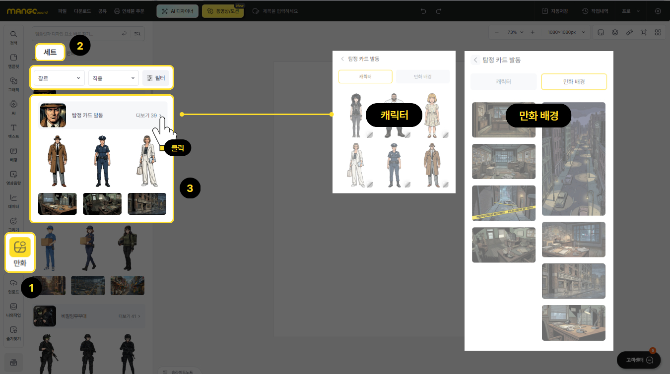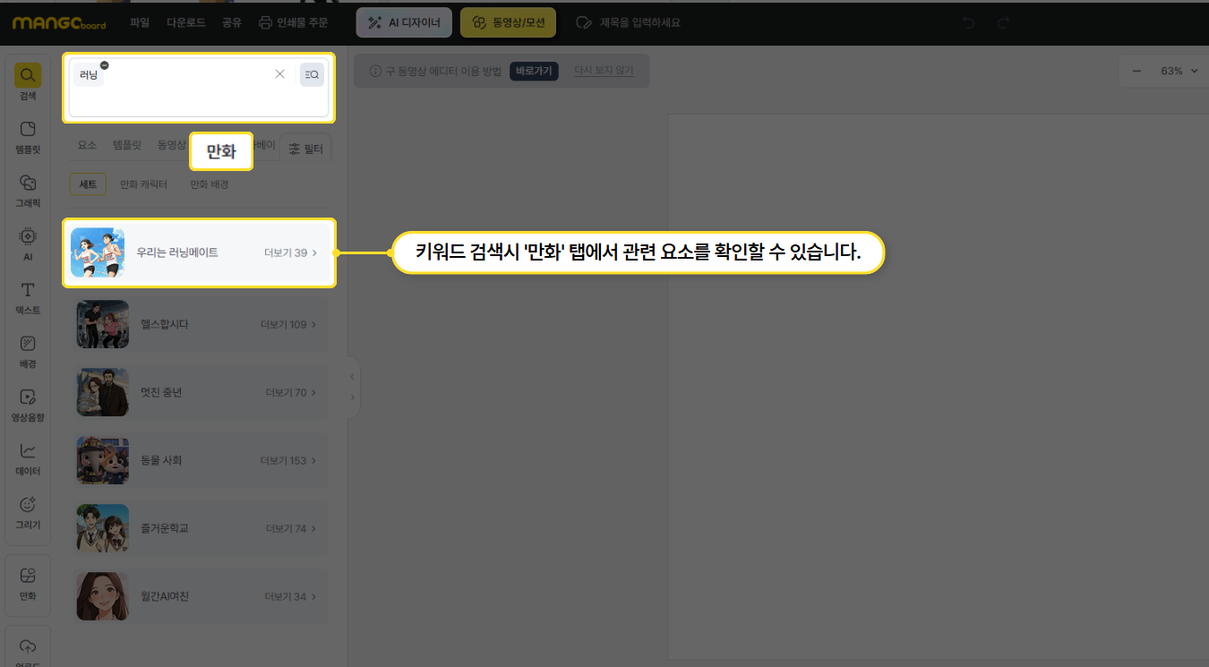 상단 검색창에 키워드 검색 후 '만화' 카테고리에서 캐릭터와 배경 세트를 확인하실 수 있습니다.