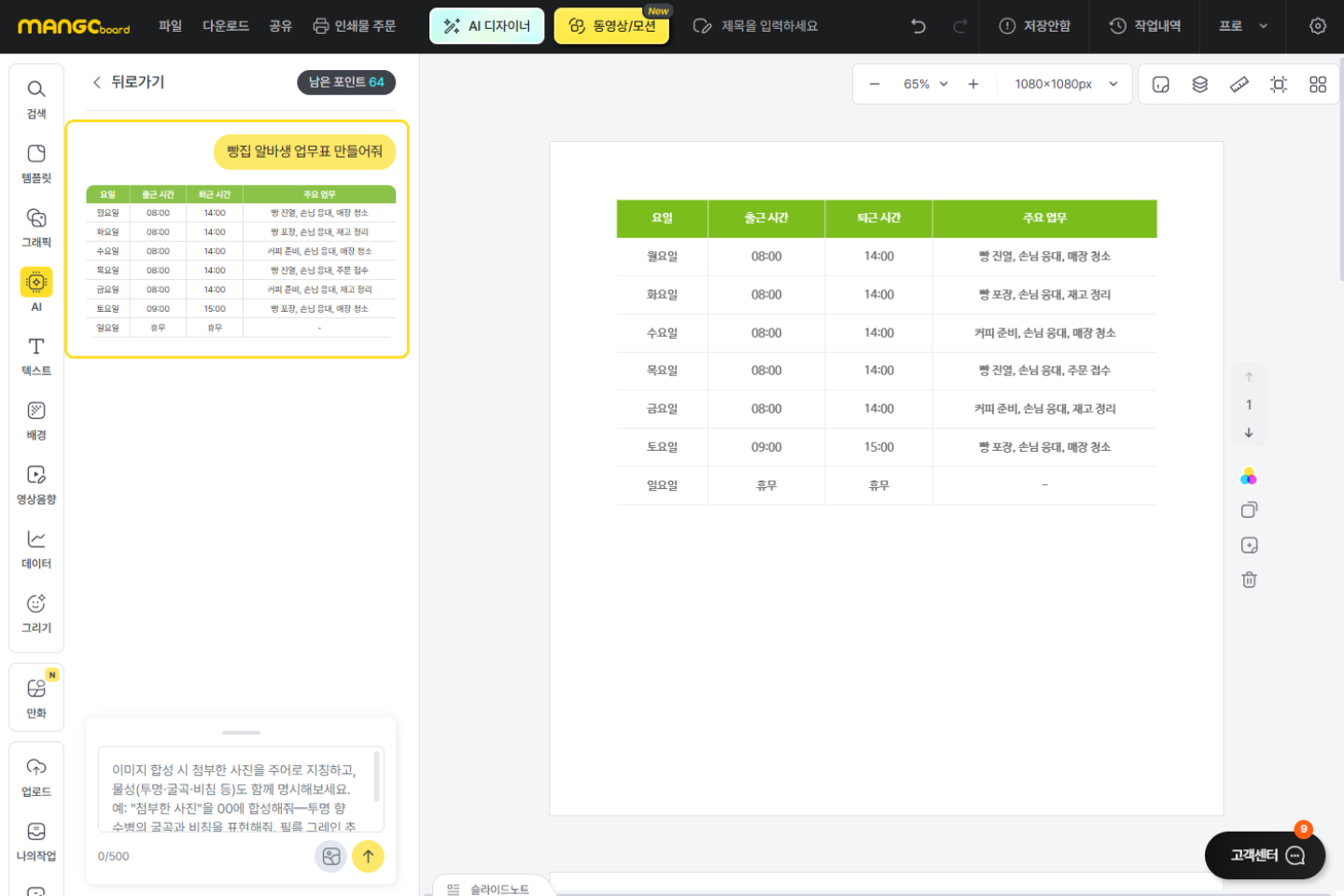 ex. “빵집 알바생 업무표 만들어줘.”, “화장품 성분표 표로 만들어줘” 등